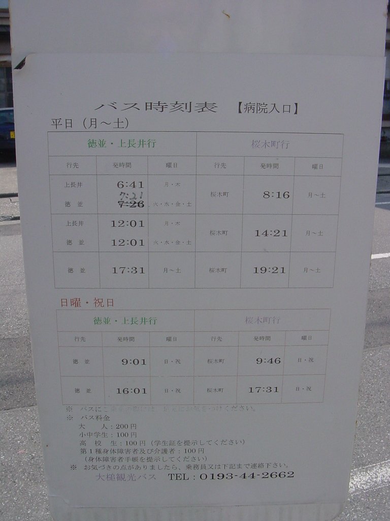 バス停 拡大表示 ダウンロード 識別子 : 11731 タイトルよみ : バステイ 說明・要約 : 病院入口前(時刻表) 作成者(撮影者) : 株式会社 邑計画事務所 作成者(撮影者)よみ : カブシキガイシャ ユウケイカクジムショ 提供者 : 株式会社 邑計画事務所 提供者よみ : カブシキガイシャ ユウケイカクジムショ 撮影(作成)場所 : 岩手県上閉伊郡大槌町 新町 撮影(作成)場所よみ : イワテケンカミヘイグンオオツチチョウ シンチョウ 作成日・撮影日 : 2003年 8月 8日 カテゴリー : 町並み 地域 : 町方地区 備考 : 一般公開