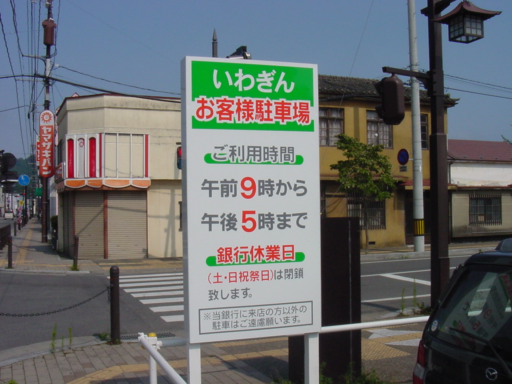 岩手銀行の看板 拡大表示 ダウンロード 識別子 : 11751 タイトルよみ : イワテギンコウノカンバン 說明・要約 : 岩手銀行第二駐車場案内看板 作成者(撮影者) : 株式会社 邑計画事務所 作成者(撮影者)よみ : カブシキガイシャ ユウケイカクジムショ 提供者 : 株式会社 邑計画事務所 提供者よみ : カブシキガイシャ ユウケイカクジムショ 撮影(作成)場所 : 岩手県上閉伊郡大槌町 本町 撮影(作成)場所よみ : イワテケンカミヘイグンオオツチチョウ ホンチョウ 作成日・撮影日 : 2003年 8月 8日 カテゴリー : 町並み 地域 : 町方地区 備考 : 一般公開