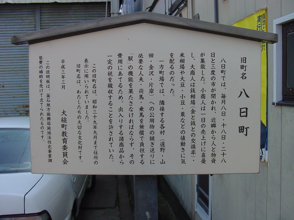 旧町名の標札 拡大表示 ダウンロード 識別子 : 11765 タイトルよみ : キュウチョウメイノヒョウサツ 說明・要約 : 旧町名八日町の表札 作成者(撮影者) : 株式会社 邑計画事務所 作成者(撮影者)よみ : カブシキガイシャ ユウケイカクジムショ 提供者 : 株式会社 邑計画事務所 提供者よみ : カブシキガイシャ ユウケイカクジムショ 撮影(作成)場所 : 岩手県上閉伊郡大槌町 撮影(作成)場所よみ : イワテケンカミヘイグンオオツチチョウ 作成日・撮影日 : 2003年 8月 8日 カテゴリー : 町並み 地域 : 町方地区 備考 : 一般公開