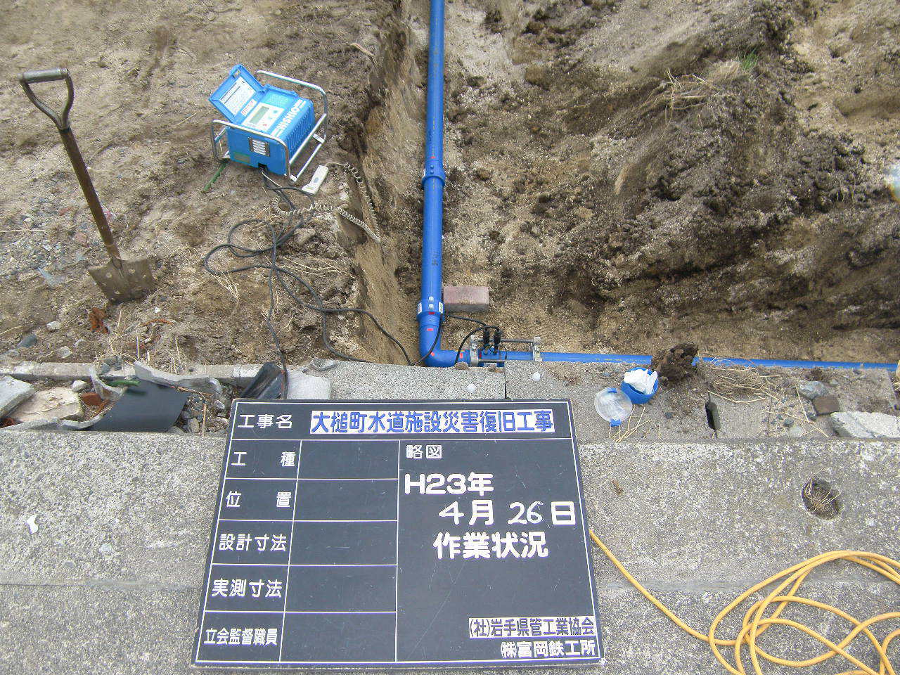 吉里吉里海岸の水道管工事 拡大表示 ダウンロード 識別子 : 2769 タイトルよみ : キリキリカイガンノスイドウカンコウジ 說明・要約 : 吉里吉里海岸付近の水道管敷設 作成者(撮影者) : 大槌町水道事業所 作成者(撮影者)よみ : オオツチチョウスイドウジギョウショ 提供者 : 大槌町 水道事業所 提供者よみ : オオツチチョウ スイドウジギョウショ 撮影(作成)場所 : 岩手県上閉伊郡大槌町 吉里吉里 撮影(作成)場所よみ : イワテケンカミヘイグンオオツチチョウ キリキリ 作成日・撮影日 : 2011年 4月 26日 カテゴリー : 水道 地域 : 吉里吉里地区 備考 : 一般公開 震災事象 ガレキ・啓開・インフラ復旧 > インフラ復旧 > 水道