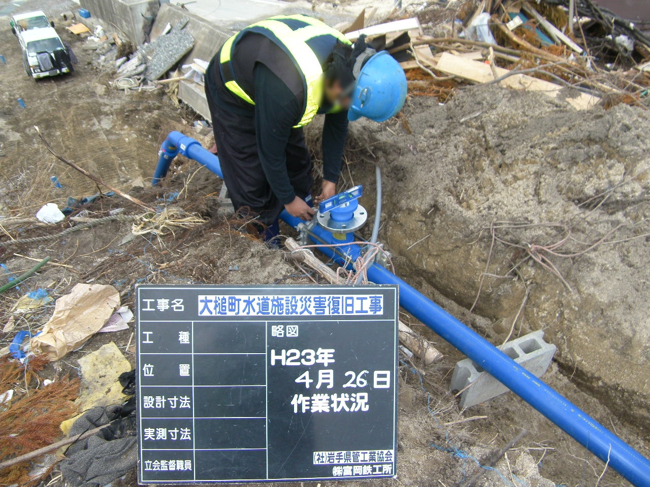吉里吉里海岸の水道管工事 拡大表示 ダウンロード 識別子 : 2774 タイトルよみ : キリキリカイガンノスイドウカンコウジ 說明・要約 : 吉里吉里海岸付近の水道管敷設 作成者(撮影者) : 大槌町水道事業所 作成者(撮影者)よみ : オオツチチョウスイドウジギョウショ 提供者 : 大槌町 水道事業所 提供者よみ : オオツチチョウ スイドウジギョウショ 撮影(作成)場所 : 岩手県上閉伊郡大槌町 吉里吉里 撮影(作成)場所よみ : イワテケンカミヘイグンオオツチチョウ キリキリ 作成日・撮影日 : 2011年 4月 26日 カテゴリー : 水道 地域 : 吉里吉里地区 備考 : 一般公開 震災事象 ガレキ・啓開・インフラ復旧 > インフラ復旧 > 水道