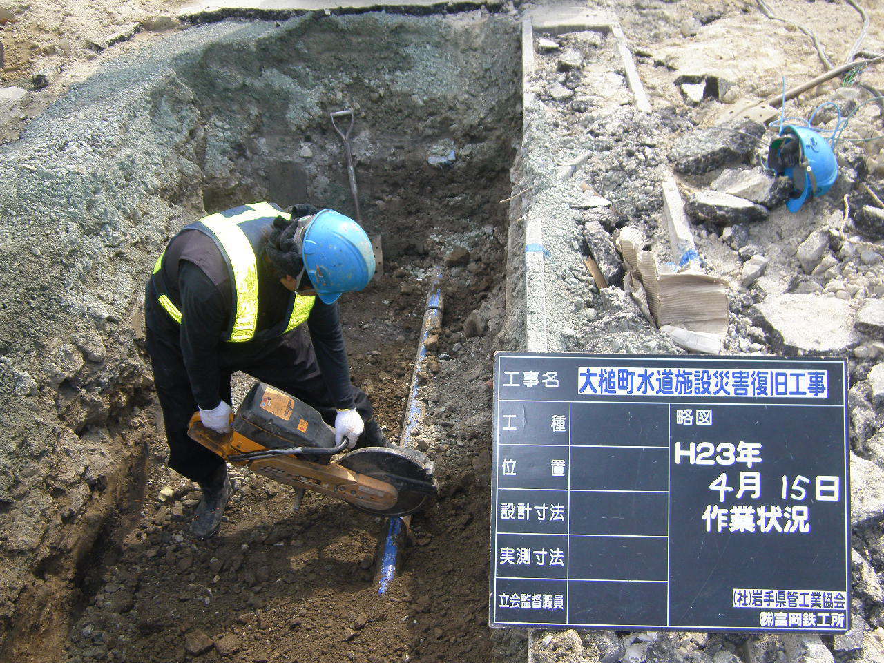 旧水道管撤去 拡大表示 ダウンロード 識別子 : 2782 タイトルよみ : キュウスイドウカンテッキョ 說明・要約 : 吉里吉里海岸付近の水道管取替え 作成者(撮影者) : 大槌町水道事業所 作成者(撮影者)よみ : オオツチチョウスイドウジギョウショ 提供者 : 大槌町 水道事業所 提供者よみ : オオツチチョウ スイドウジギョウショ 撮影(作成)場所 : 岩手県上閉伊郡大槌町 吉里吉里 撮影(作成)場所よみ : イワテケンカミヘイグンオオツチチョウ キリキリ 作成日・撮影日 : 2011年 4月 15日 カテゴリー : 水道 地域 : 吉里吉里地区 備考 : 一般公開 震災事象 ガレキ・啓開・インフラ復旧 > インフラ復旧 > 水道
