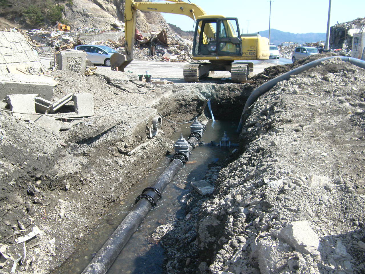 安渡付近水道復旧工事 拡大表示 ダウンロード 識別子 : 2827 タイトルよみ : アンドフキンスイドウフッキュウコウジ 說明・要約 : 水道管を掘り起こして復旧している 作成者(撮影者) : 大槌町水道事業所 作成者(撮影者)よみ : オオツチチョウスイドウジギョウショ 提供者 : 大槌町 水道事業所 提供者よみ : オオツチチョウ スイドウジギョウショ 撮影(作成)場所 : 岩手県上閉伊郡大槌町 安渡 撮影(作成)場所よみ : イワテケンカミヘイグンオオツチチョウ アンド 作成日・撮影日 : 2011年 4月 5日 カテゴリー : 水道 地域 : 安渡地区 備考 : 一般公開 震災事象 ガレキ・啓開・インフラ復旧 > インフラ復旧 > 水道