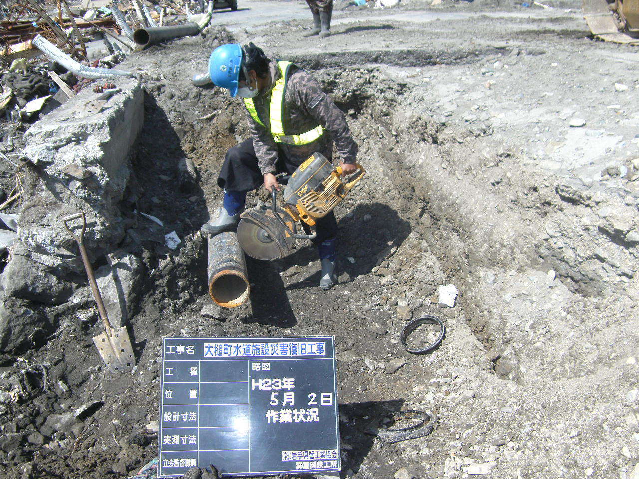 町内の旧水道管取り出し 拡大表示 ダウンロード 識別子 : 2937 タイトルよみ : チョウナイノキュウスイドウカントリダシ 說明・要約 : 国道付近の古い水道管を取り出した 作成者(撮影者) : 大槌町水道事業所 作成者(撮影者)よみ : オオツチチョウスイドウジギョウショ 提供者 : 大槌町 水道事業所 提供者よみ : オオツチチョウ スイドウジギョウショ 撮影(作成)場所 : 岩手県上閉伊郡大槌町 大町 撮影(作成)場所よみ : イワテケンカミヘイグンオオツチチョウ オオマチ 作成日・撮影日 : 2011年 5月 2日 カテゴリー : 水道 地域 : 町方地区 備考 : 一般公開 震災事象 ガレキ・啓開・インフラ復旧 > インフラ復旧 > 水道