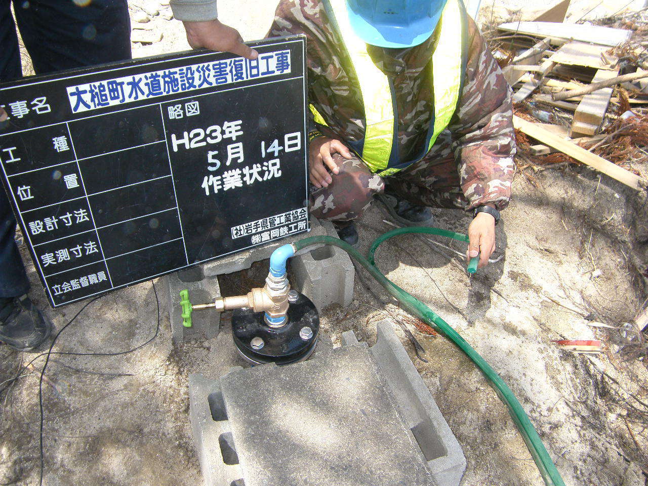 水道管設備の取り付け 拡大表示 ダウンロード 識別子 : 2946 タイトルよみ : スイドウカンセツビノトリツケ 說明・要約 : 道路沿いの側溝内の水道管を整備 作成者(撮影者) : 大槌町水道事業所 作成者(撮影者)よみ : オオツチチョウスイドウジギョウショ 提供者 : 大槌町 水道事業所 提供者よみ : オオツチチョウ スイドウジギョウショ 撮影(作成)場所 : 岩手県上閉伊郡大槌町 大槌町 撮影(作成)場所よみ : イワテケンカミヘイグンオオツチチョウ オオツチチョウ 作成日・撮影日 : 2011年 5月 14日 カテゴリー : 水道 地域 : その他 備考 : 一般公開 震災事象 ガレキ・啓開・インフラ復旧 > インフラ復旧 > 水道