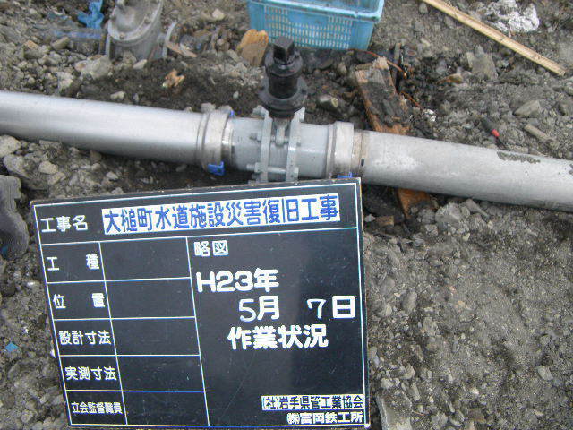 新町付近水道管の設置作業 拡大表示 ダウンロード 識別子 : 3039 タイトルよみ : シンチョウフキンスイドウカンノセッチサギョウ 說明・要約 : 大槌川沿いの水道管設置 作成者(撮影者) : 大槌町水道事業所 作成者(撮影者)よみ : オオツチチョウスイドウジギョウショ 提供者 : 大槌町 水道事業所 提供者よみ : オオツチチョウ スイドウジギョウショ 撮影(作成)場所 : 岩手県上閉伊郡大槌町 新町 撮影(作成)場所よみ : イワテケンカミヘイグンオオツチチョウ シンチョウ 作成日・撮影日 : 2011年 5月 7日 カテゴリー : 水道 地域 : 町方地区 備考 : 一般公開 震災事象 ガレキ・啓開・インフラ復旧 > インフラ復旧 > 水道