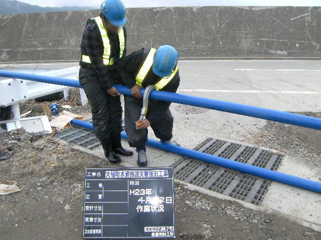 災害水道復旧工事 拡大表示 ダウンロード 識別子 : 3063 タイトルよみ : サイガイスイドウフッキュウコウジ 說明・要約 : 排水溝内で水道管工事 作成者(撮影者) : 大槌町水道事業所 作成者(撮影者)よみ : オオツチチョウスイドウジギョウショ 提供者 : 大槌町 水道事業所 提供者よみ : オオツチチョウ スイドウジギョウショ 撮影(作成)場所 : 岩手県上閉伊郡大槌町 大槌町 撮影(作成)場所よみ : イワテケンカミヘイグンオオツチチョウ オオツチチョウ 作成日・撮影日 : 2011年 4月 22日 カテゴリー : 水道 地域 : その他 備考 : 一般公開 震災事象 ガレキ・啓開・インフラ復旧 > インフラ復旧 > 水道