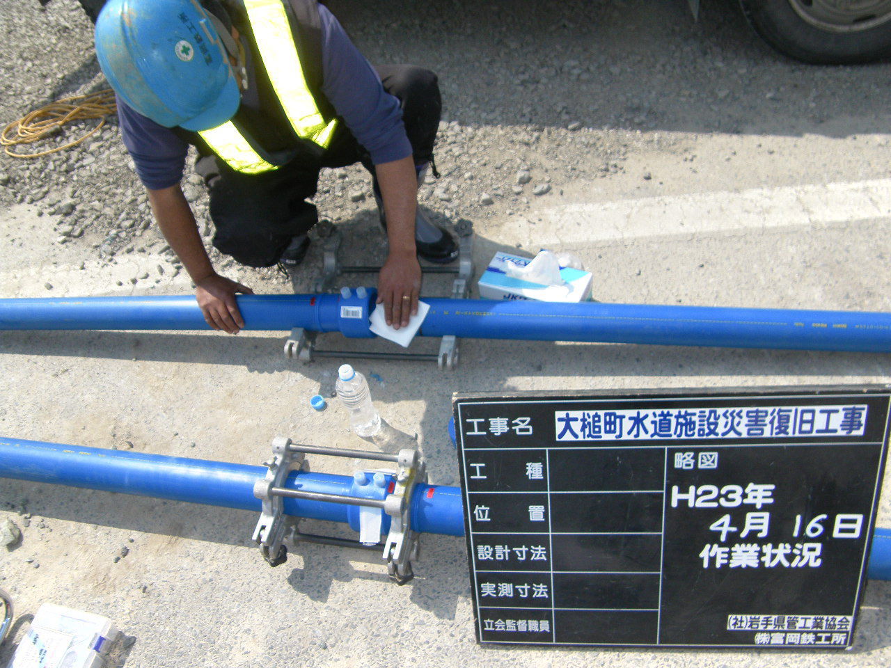 吉里吉里海岸付近で水道管設置 拡大表示 ダウンロード 識別子 : 3296 タイトルよみ : キリキリカイガンフキンデスイドウカンセッチ 說明・要約 : 配管の連結、設置のための準備の様子 作成者(撮影者) : 大槌町水道事業所 作成者(撮影者)よみ : オオツチチョウスイドウジギョウショ 提供者 : 大槌町 水道事業所 提供者よみ : オオツチチョウ スイドウジギョウショ 撮影(作成)場所 : 岩手県上閉伊郡大槌町 吉里吉里 撮影(作成)場所よみ : イワテケンカミヘイグンオオツチチョウ キリキリ 作成日・撮影日 : 2011年 4月 16日 カテゴリー : 水道 地域 : 吉里吉里地区 備考 : 一般公開 震災事象 ガレキ・啓開・インフラ復旧 > インフラ復旧 > 水道