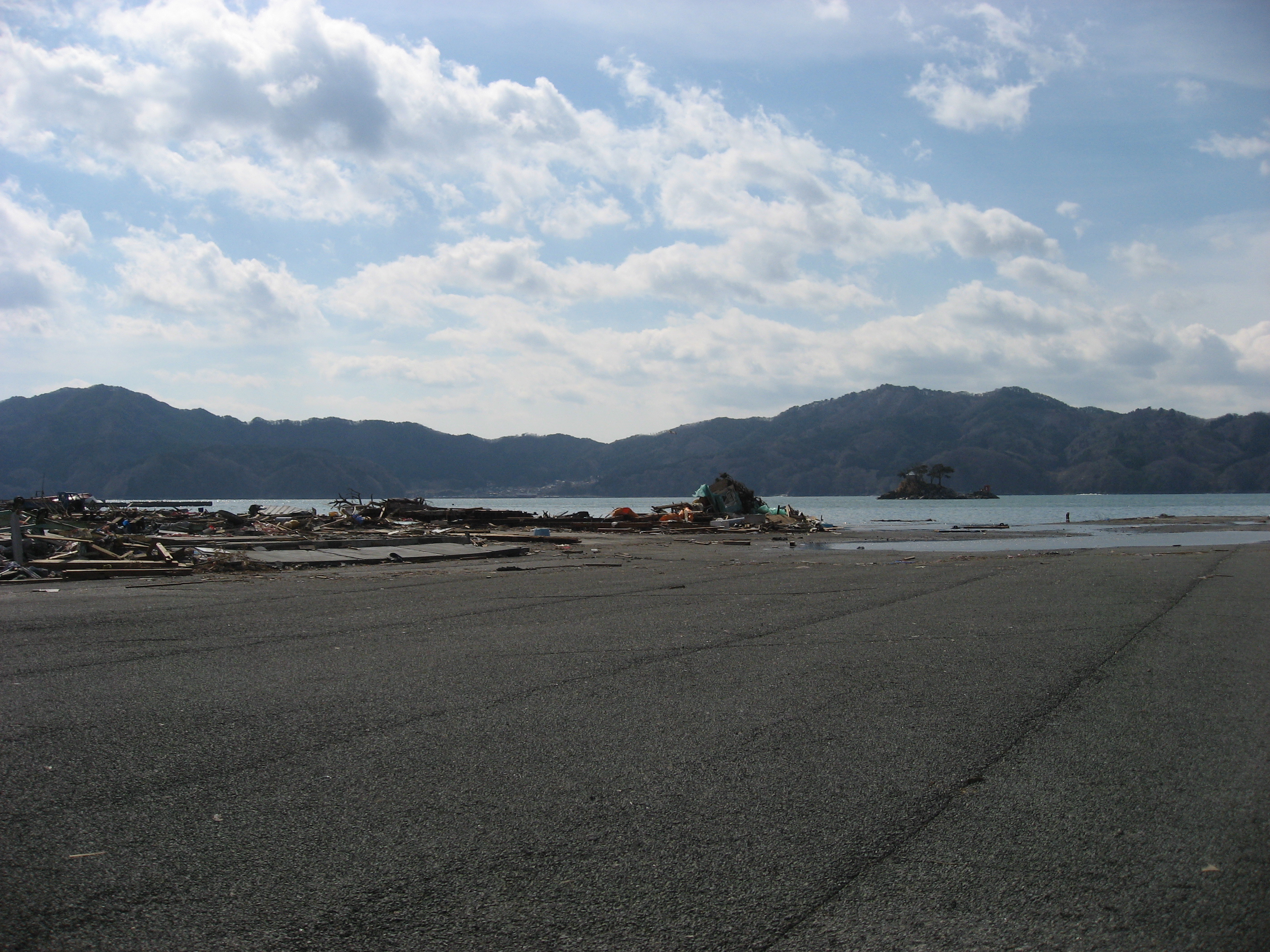大槌町赤浜の、「岡本造船所」から、蓬莱島(ひょうたん島)方面を撮影。地盤沈下のためか、海水により浸水している。