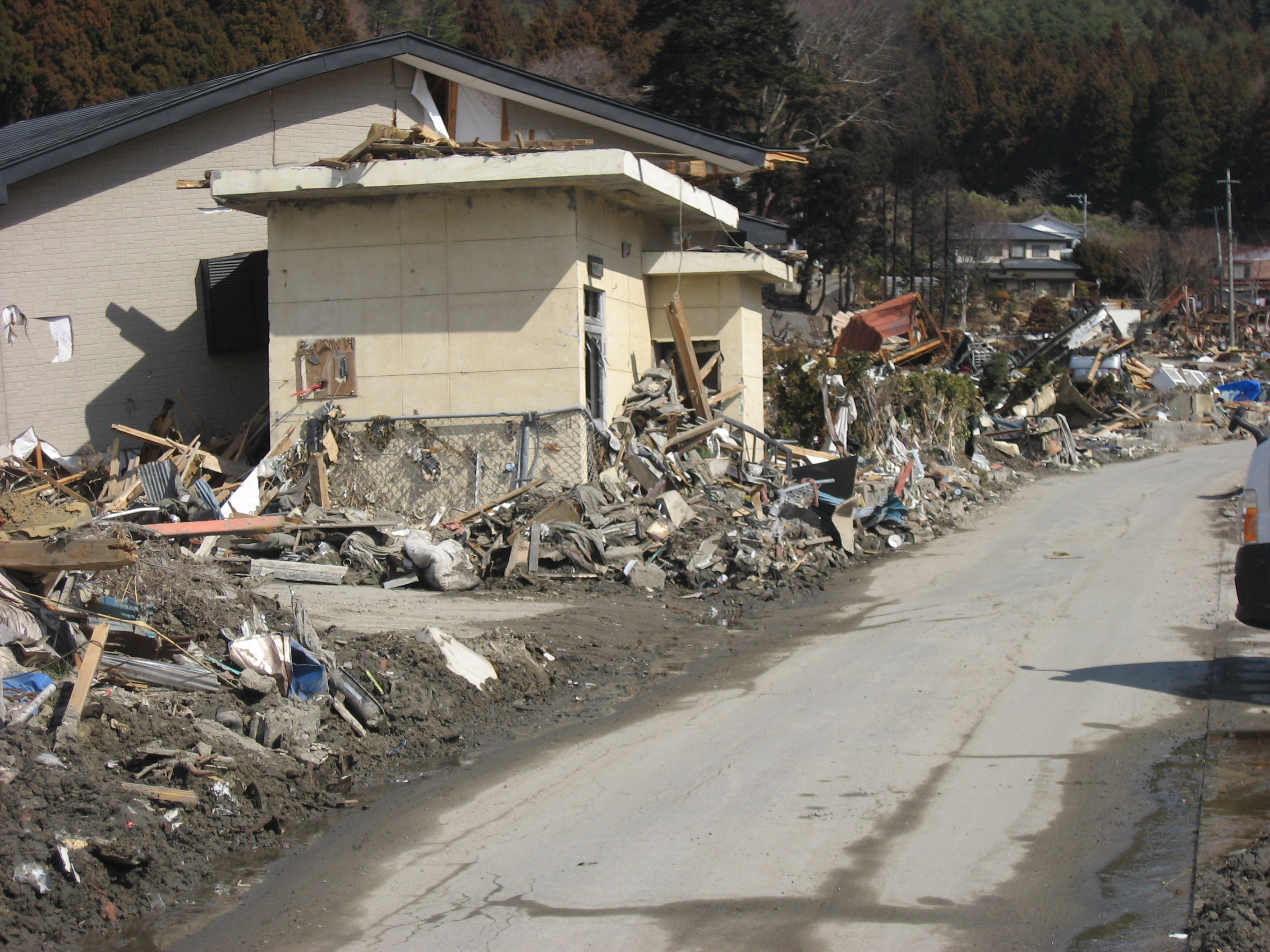 大槌町赤浜の、赤浜増圧ポンプ場周辺。道路沿いにガレキが分けられている。