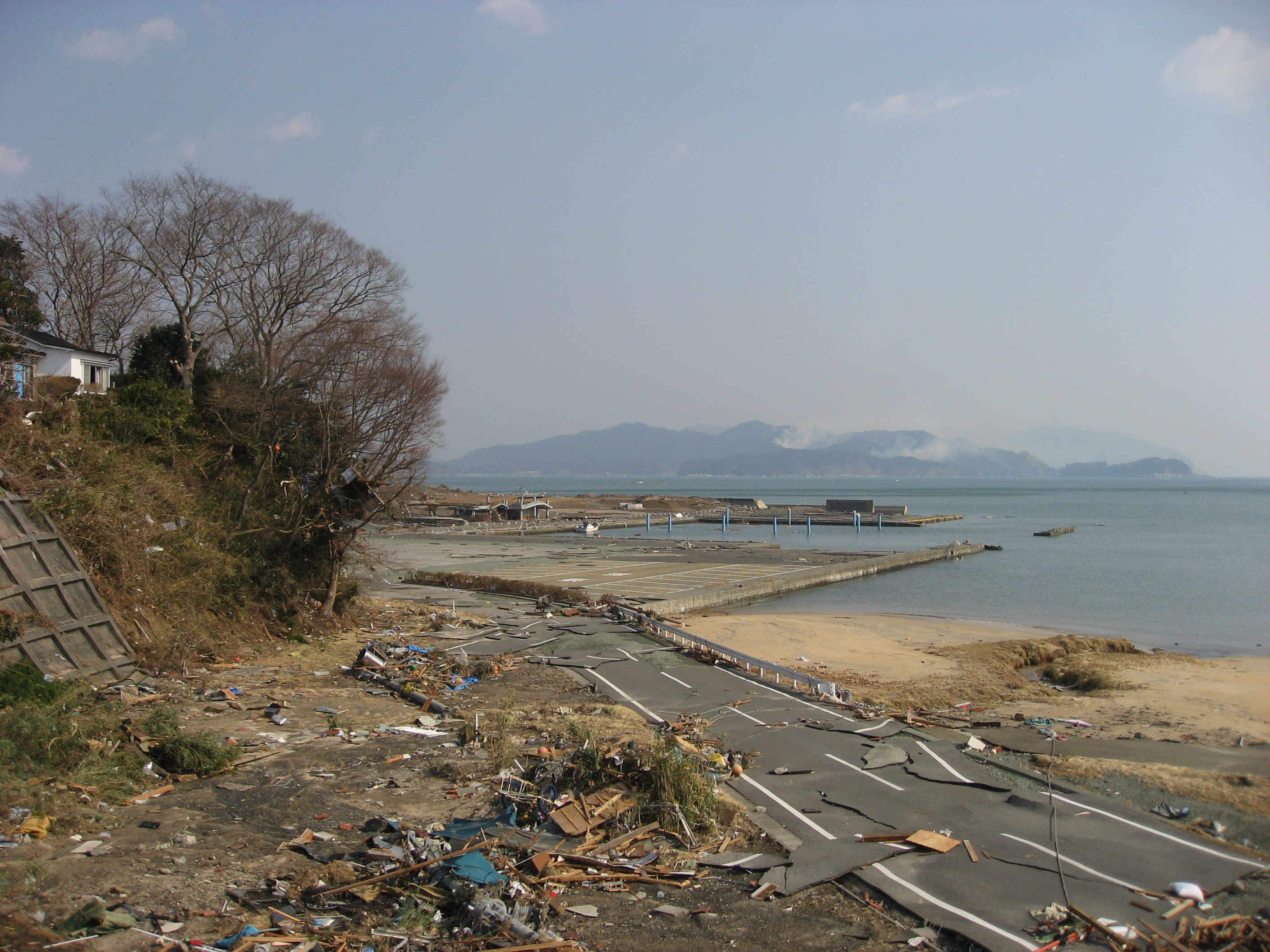 大槌町吉里吉里地区、吉里吉里海岸周辺を撮影。舗装がはがれており、ガレキが散乱している。
