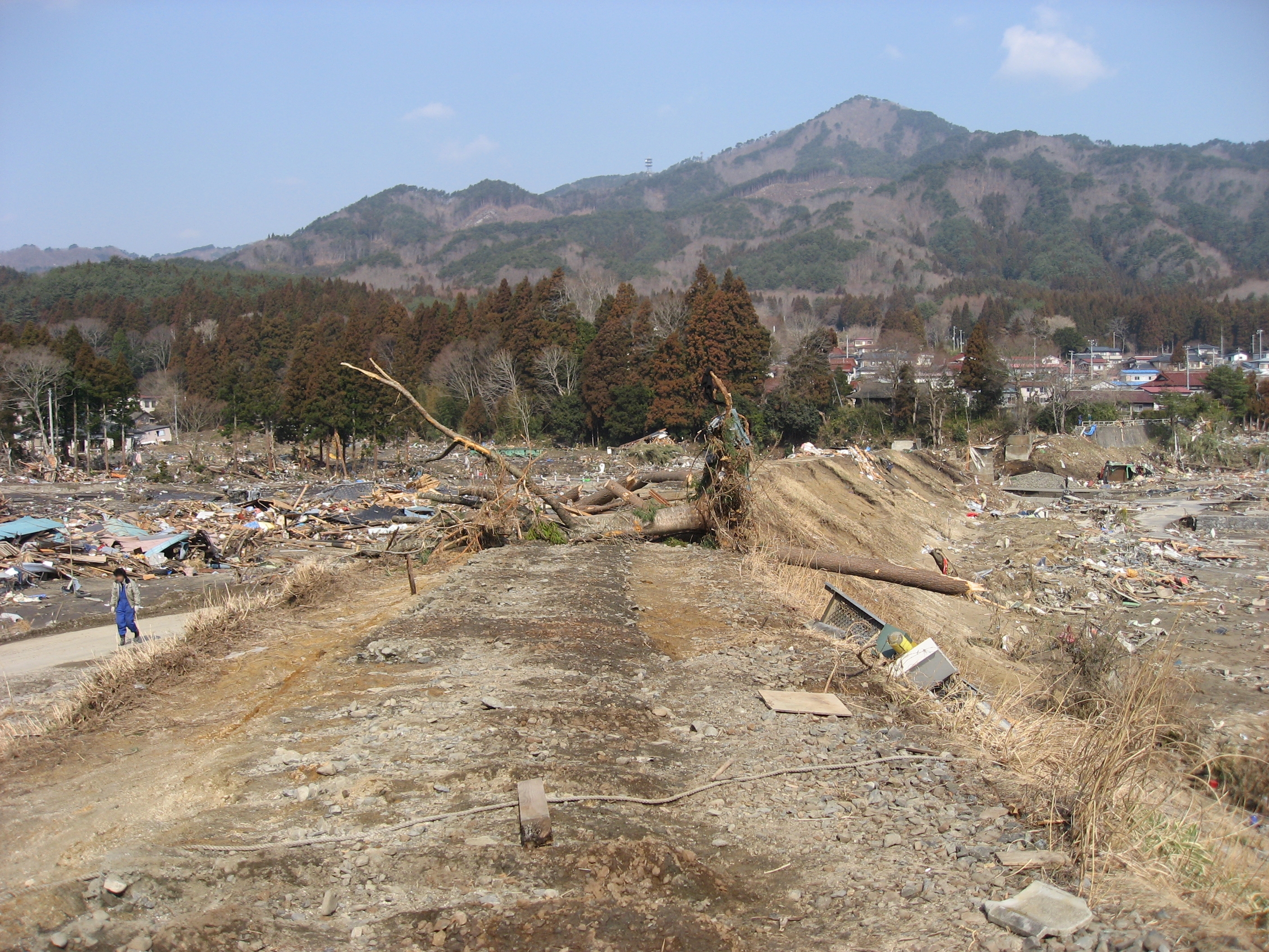 大槌町浪板地区、浪板観光ホテル付近の、JR山田線の被災した線路跡。右側が海岸。