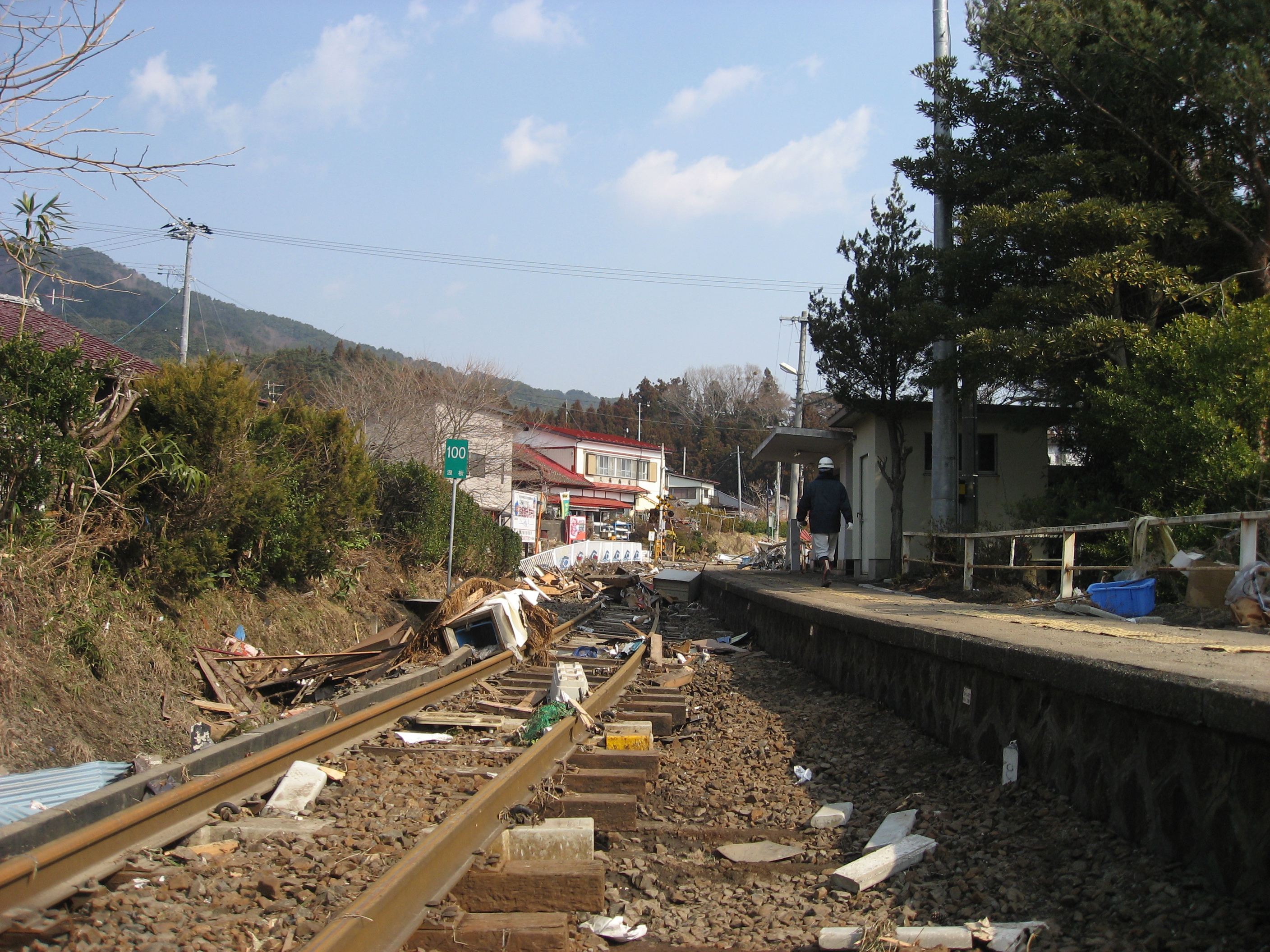大槌町浪板地区、JR山田線「浪板海岸」駅より、北方向を撮影。線路内にもガレキが散乱している。