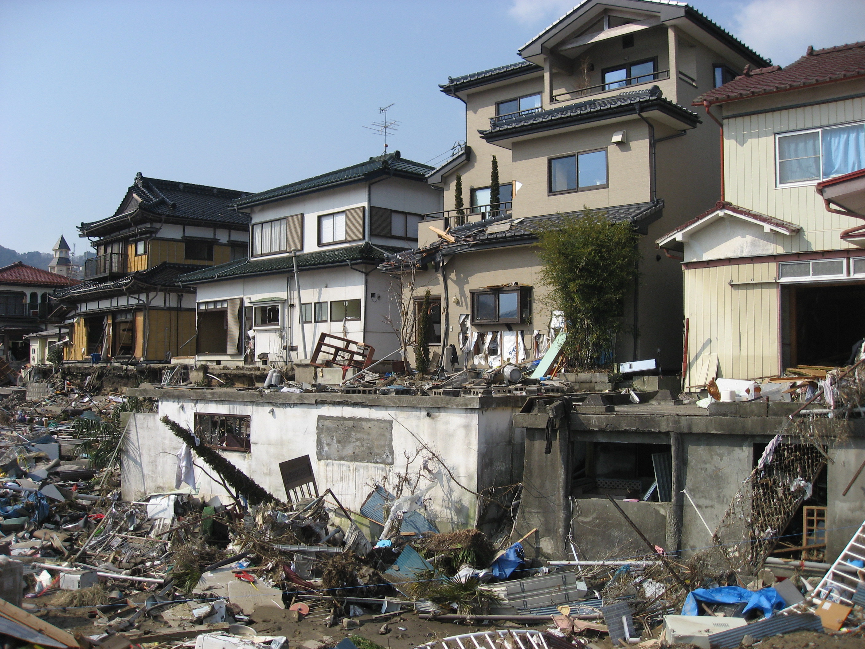 大槌町吉里吉里3丁目の国道45号線より、住宅地を撮影。住宅の損壊があり、ガレキが散乱している。