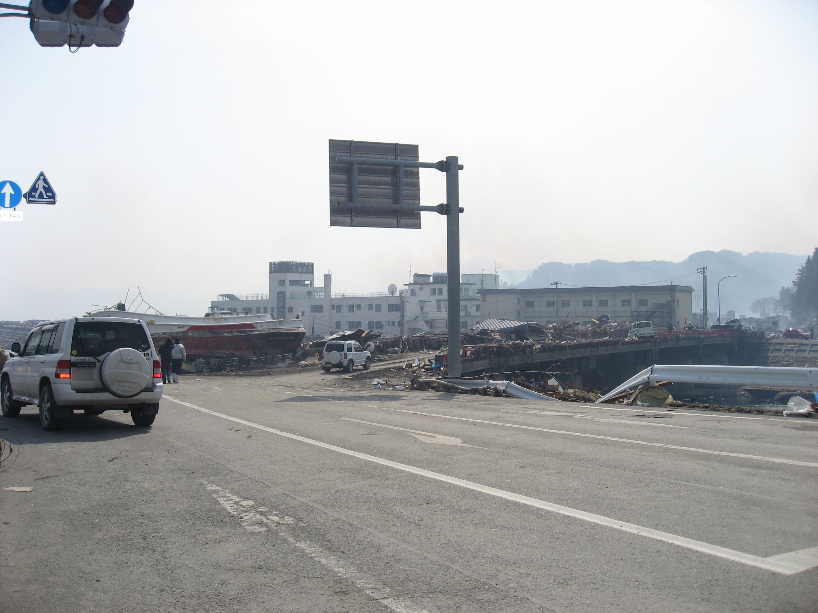 大槌町国道45号大槌バイパス沢山交差点付近から、県立大槌病院の方向を撮影。ガレキや車、船がのこっている。