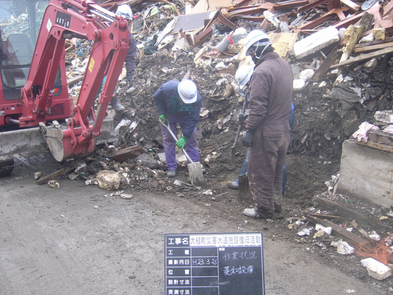 水道管を掘り出す作業員 拡大表示 ダウンロード 識別子 : 3311 タイトルよみ : スイドウカンヲホリダスサギョウイン 說明・要約 : 災害水道復旧作業現場撮影 作成者(撮影者) : 大槌町水道事業所 作成者(撮影者)よみ : オオツチチョウスイドウジギョウショ 提供者 : 大槌町 水道事業所 提供者よみ : オオツチチョウ スイドウジギョウショ 撮影(作成)場所 : 岩手県上閉伊郡大槌町 大槌町 撮影(作成)場所よみ : イワテケンカミヘイグンオオツチチョウ オオツチチョウ 作成日・撮影日 : 2011年 3月 26日 カテゴリー : 水道 地域 : その他 備考 : 一般公開 震災事象 ガレキ・啓開・インフラ復旧 > インフラ復旧 > 水道