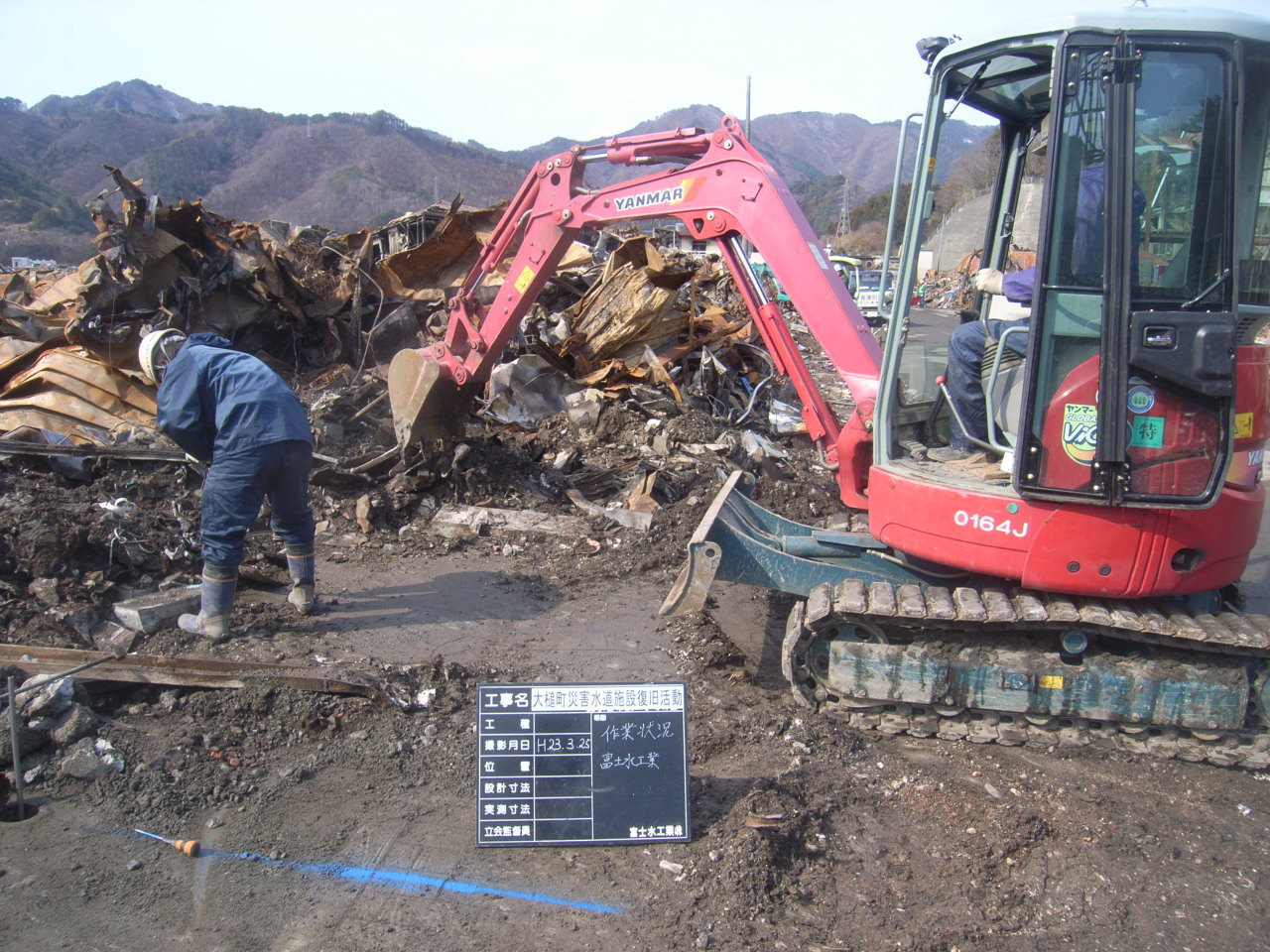水道復旧のためガレキの中から水道管を探している作業現場撮影