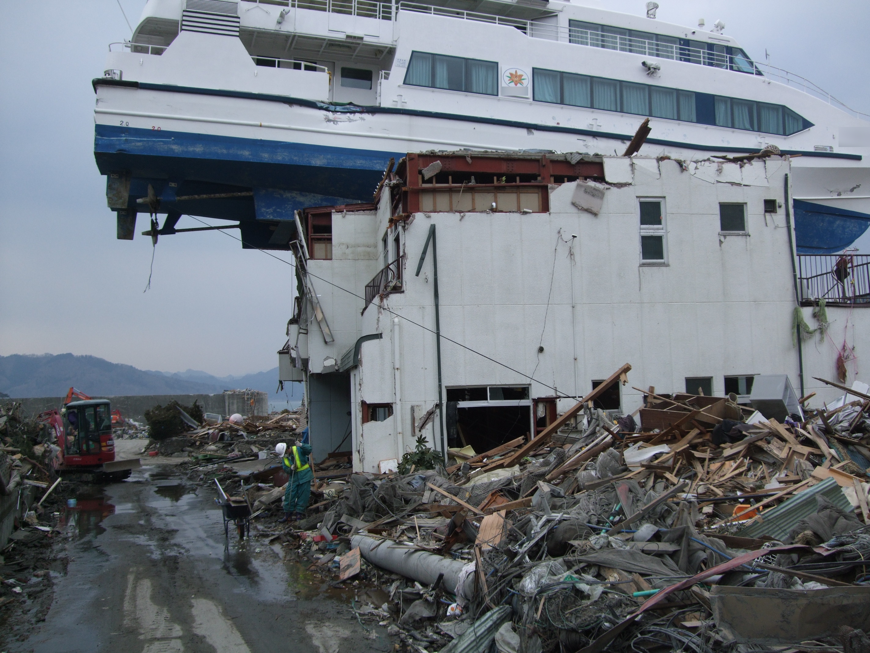 民宿あかぶ屋上に、観光船はまゆりがのりあげている、船体右側からの撮影。周囲にはガレキ。
