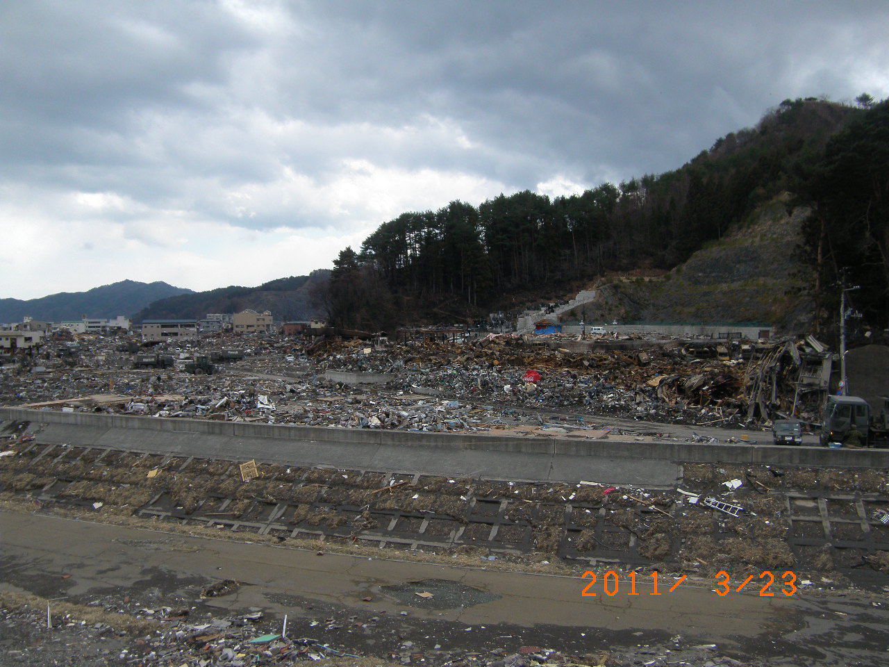 大槌バイパス沢山交差点より、大槌川南岸の被災状況を撮影。
