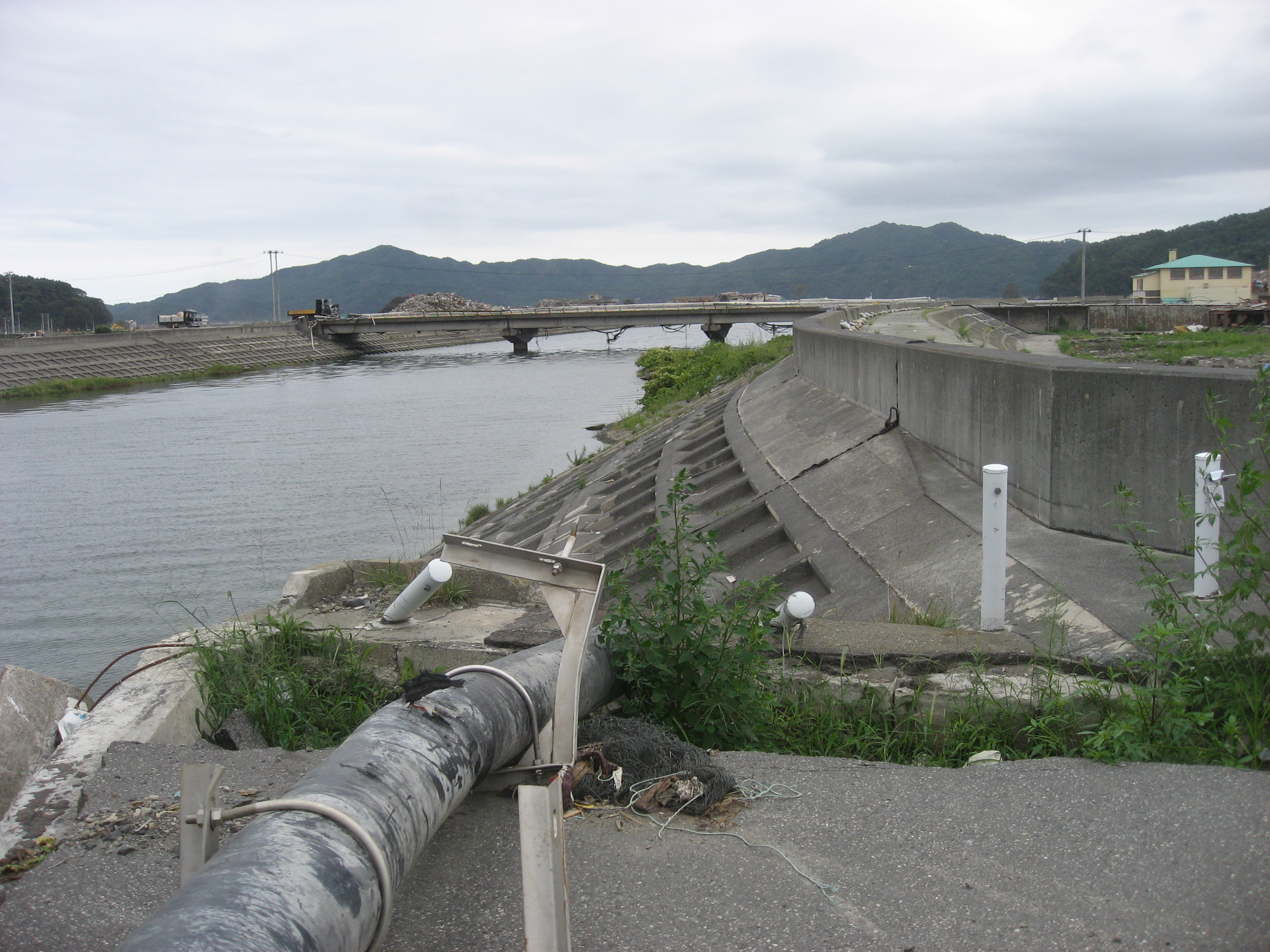 堤防付近はきれいに片付けられている 安渡地区にガレキが集められているのが見える