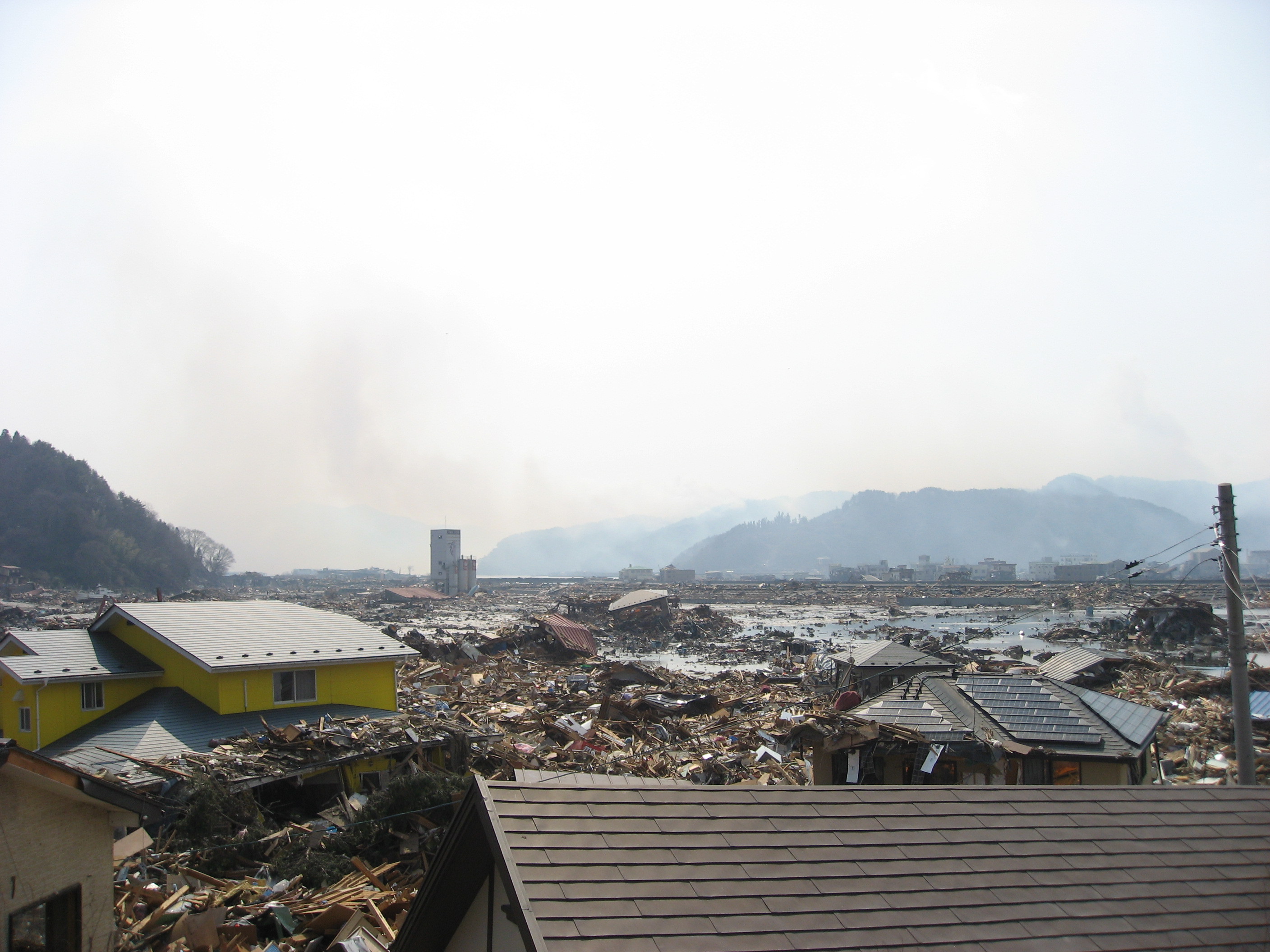 震災の爪あと 町はガレキとなり いたるところから火災の煙が昇る