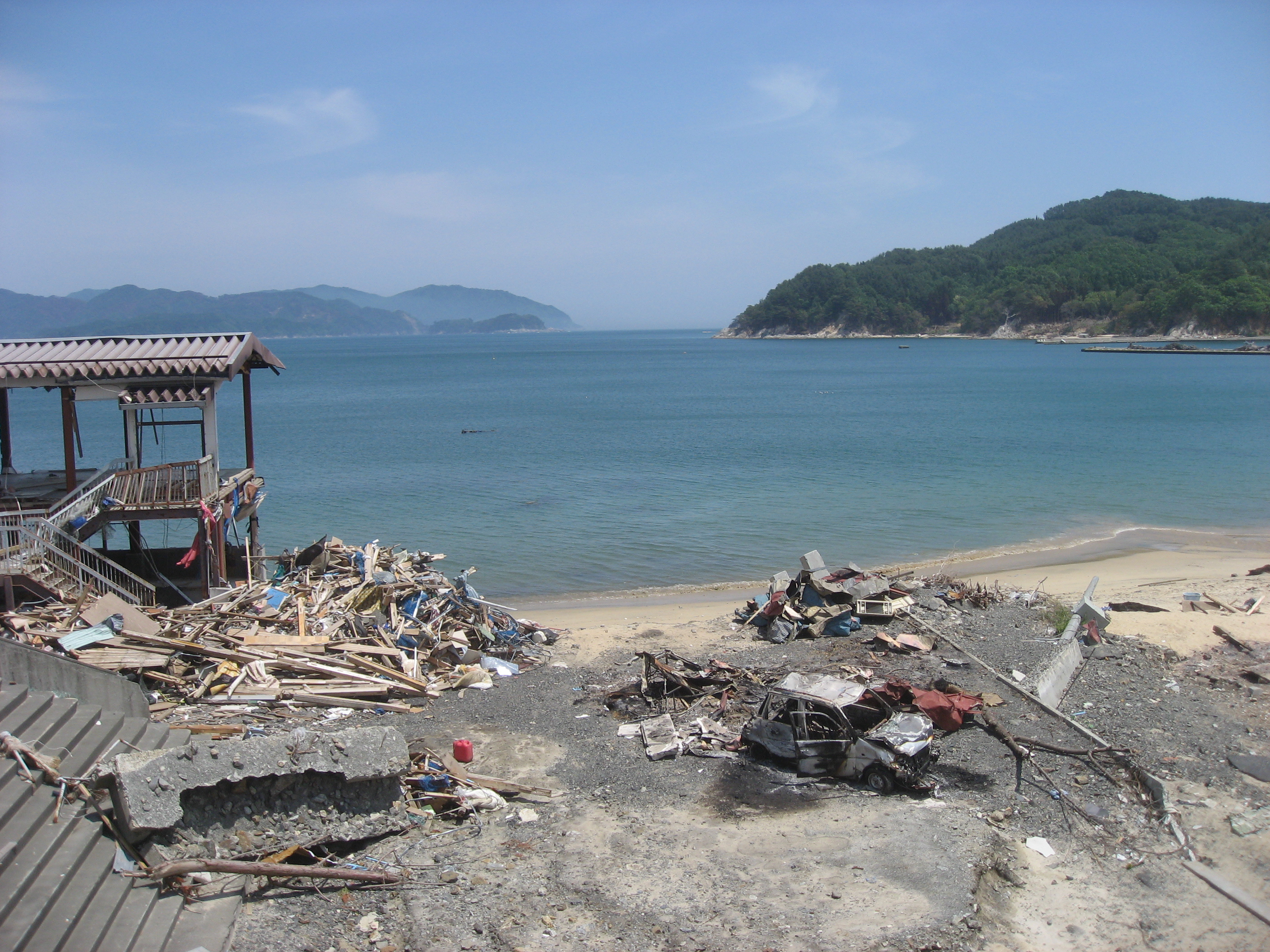 吉里吉里海岸管理事務所跡地から見た吉里吉里海水浴場。ガレキが流れ着いている。