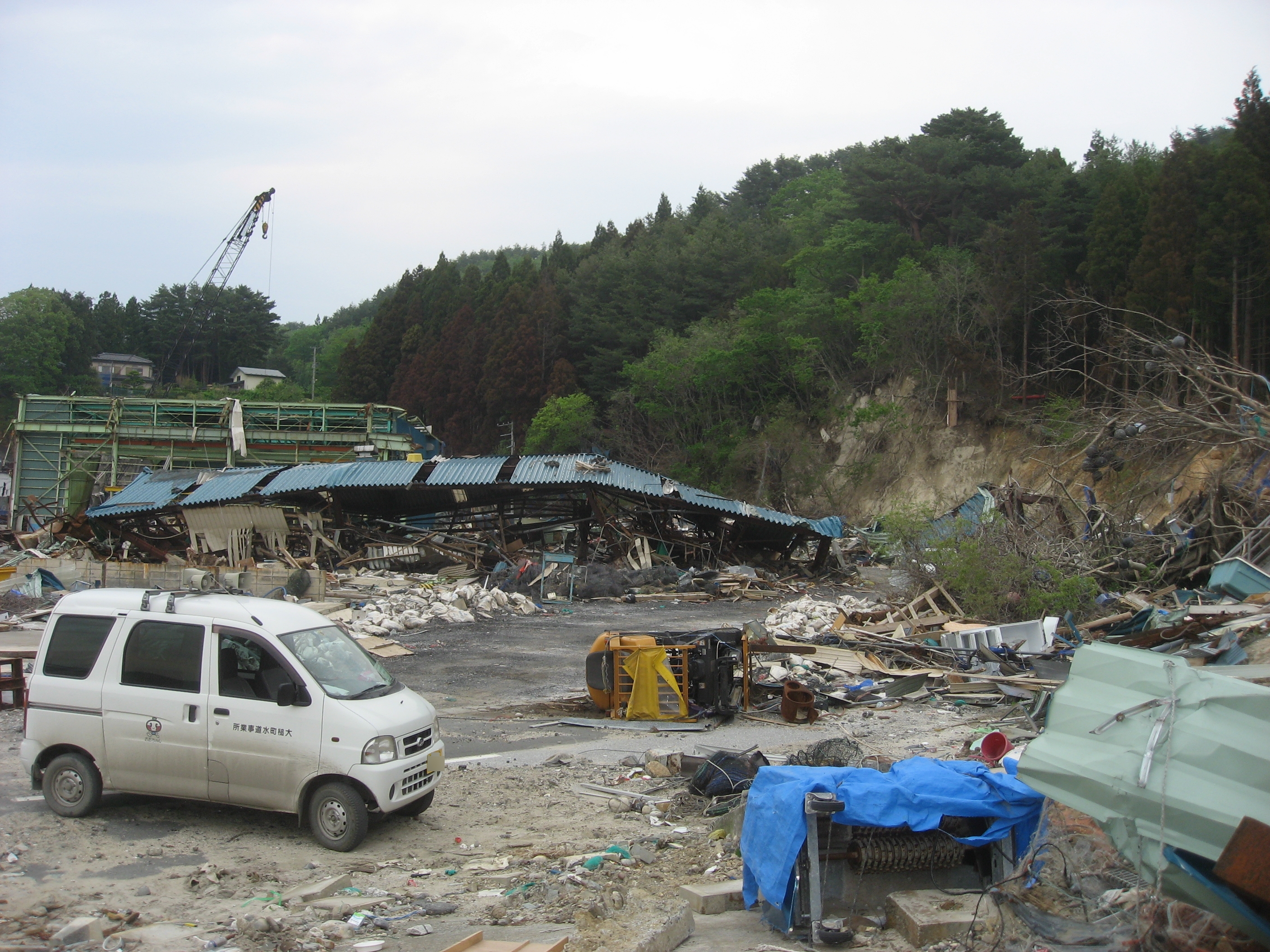 被災した漁師の作業場。高台には被災を免れた民家がある。