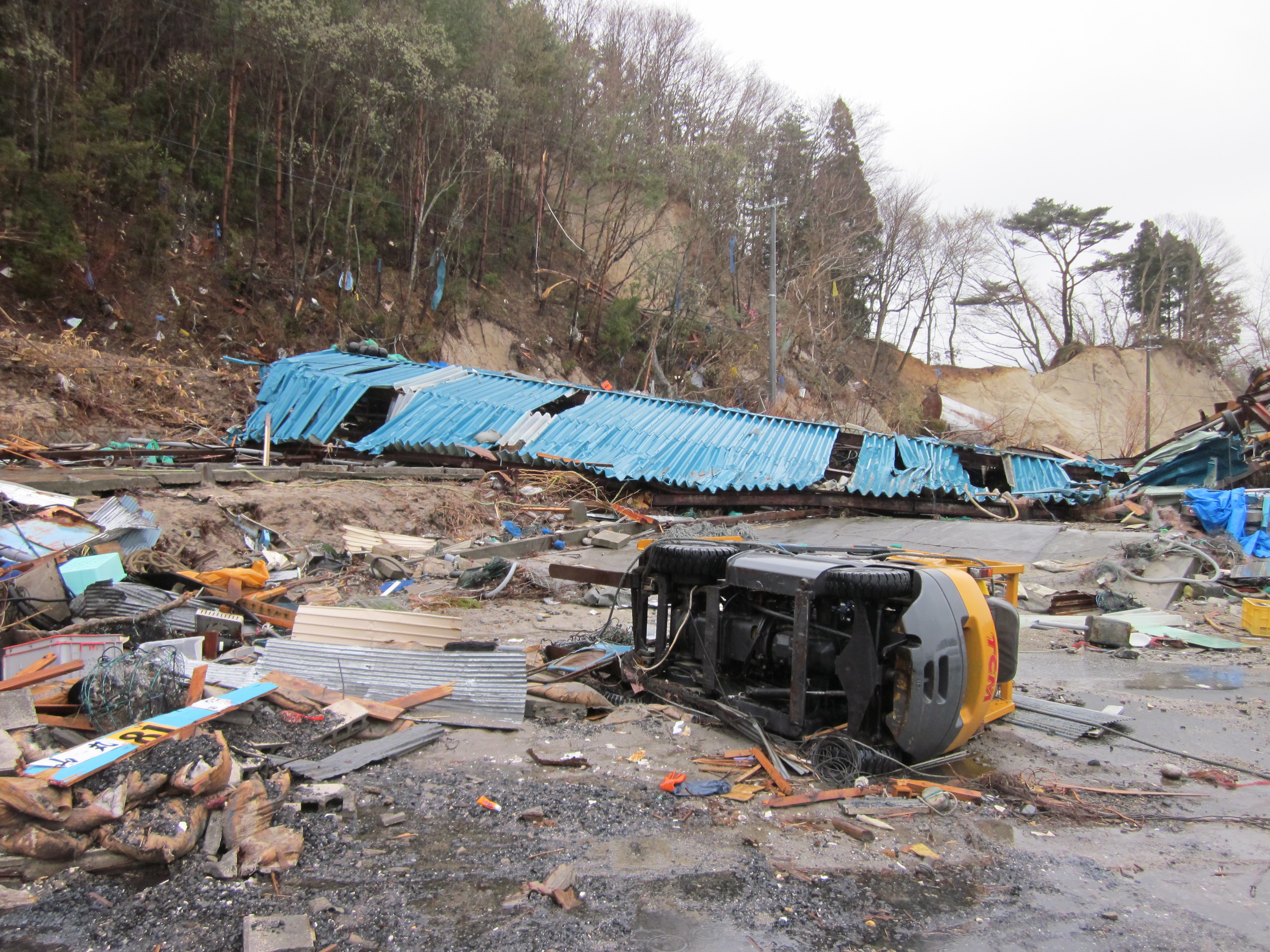 吉里吉里海岸三陸園下付近、被災し流されたフォークリフト