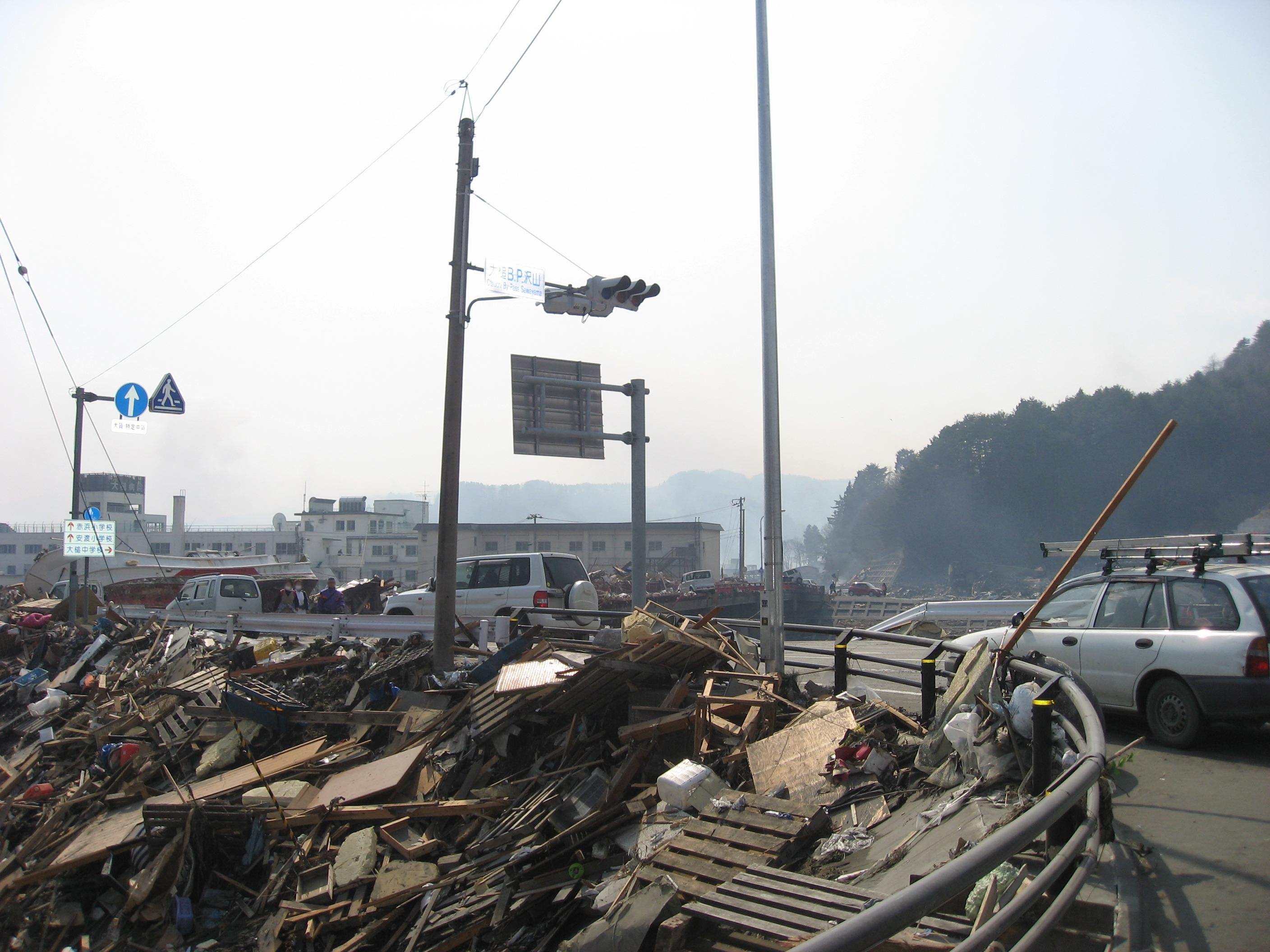 道路は復旧されているが道路脇にはガレキの山