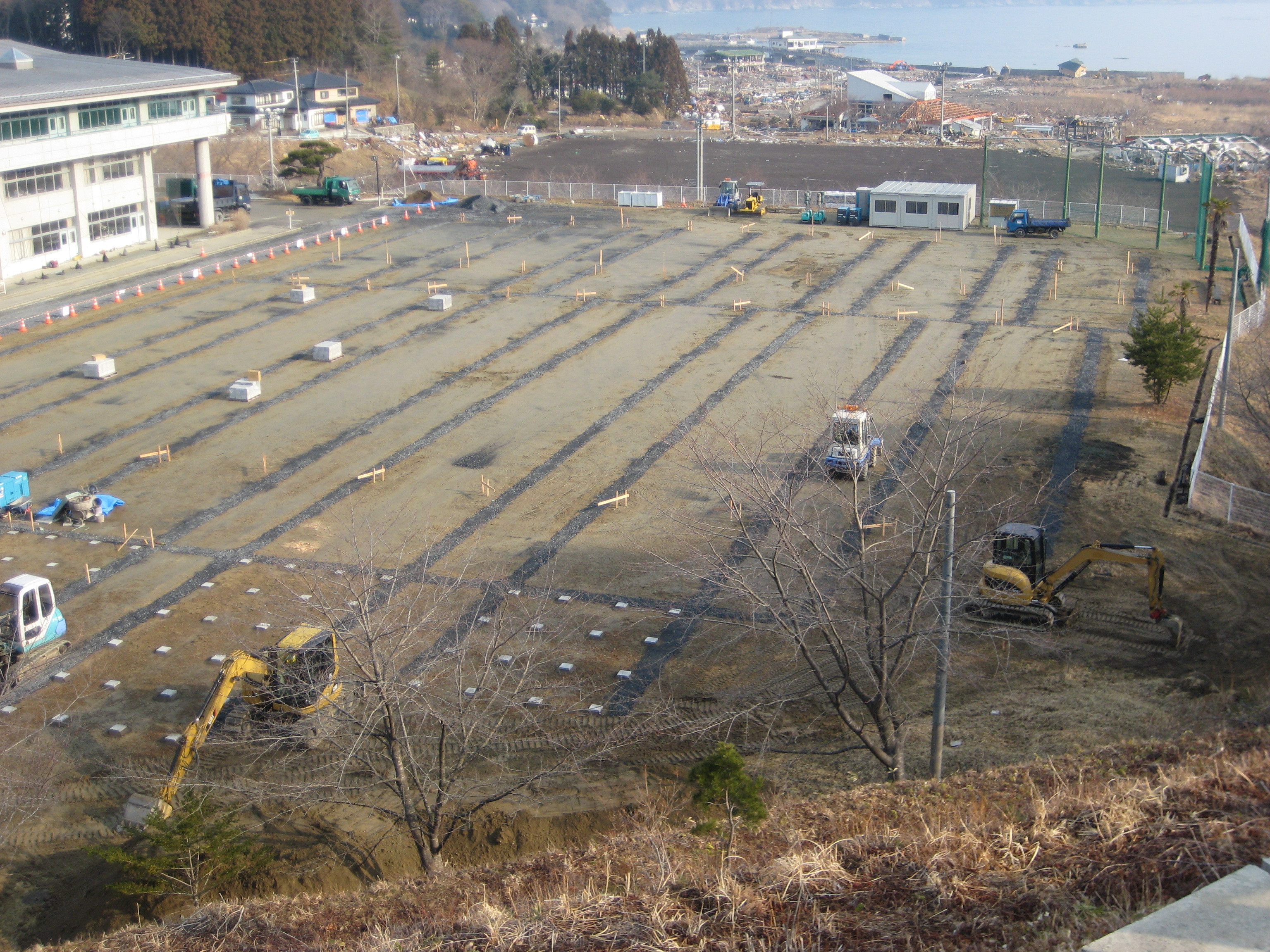 吉里吉里中学校の校庭に仮設住宅が建設される様子を撮影