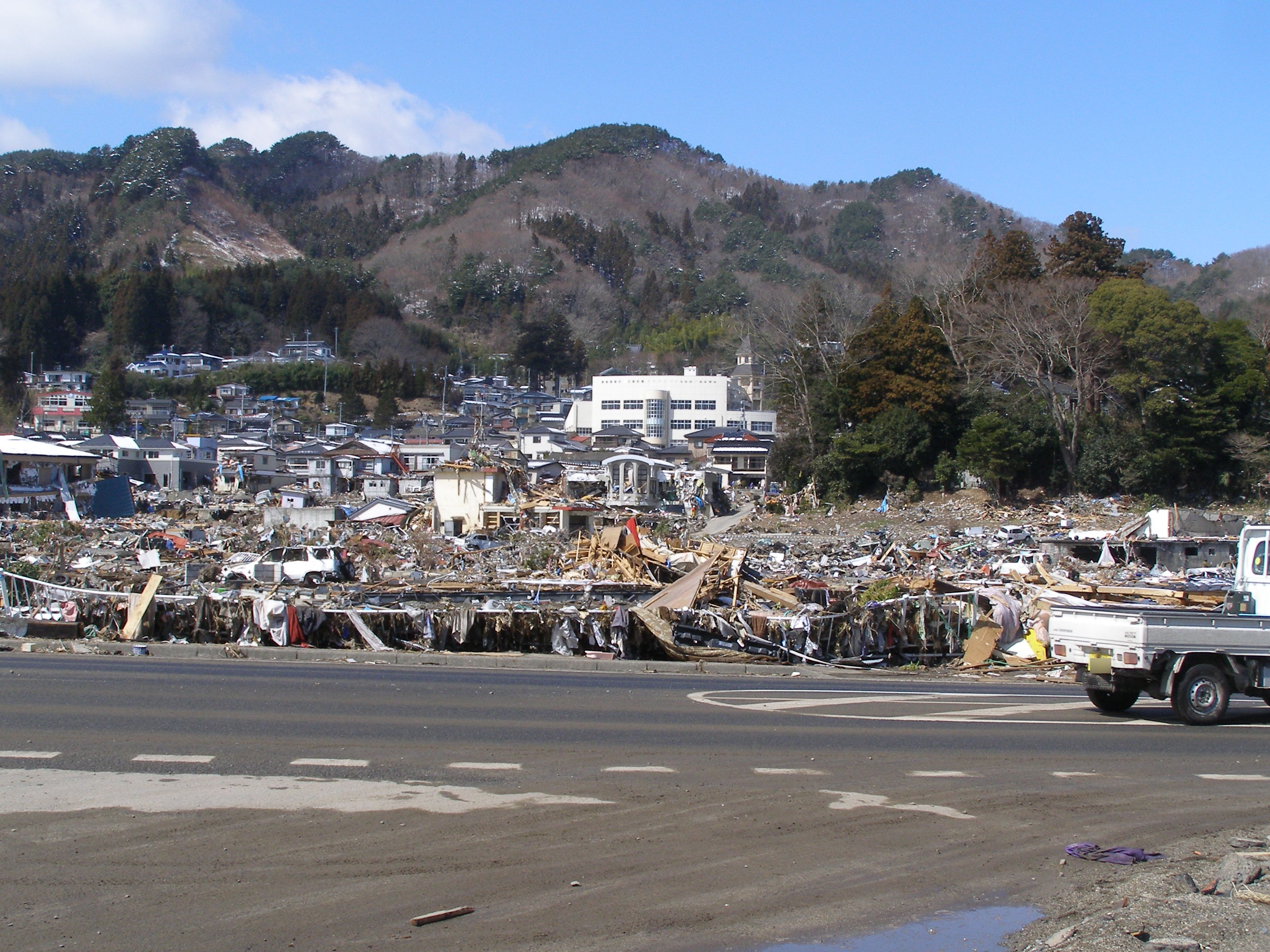 吉里吉里海岸付近の国道45号から撮影した、吉里吉里小学校方面の被災状況