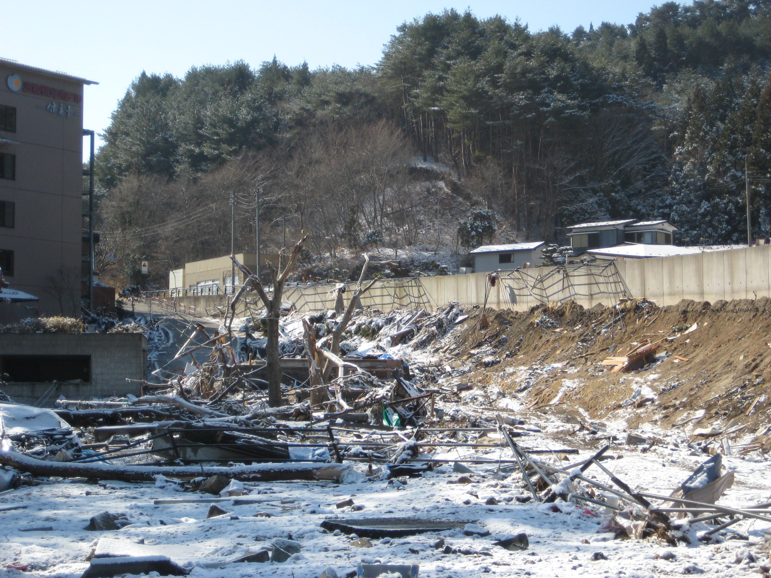 浪板観光ホテル付近のガレキに雪が積もり白く染めた様子。ガードレールが破壊され土台の土が崩壊してる。