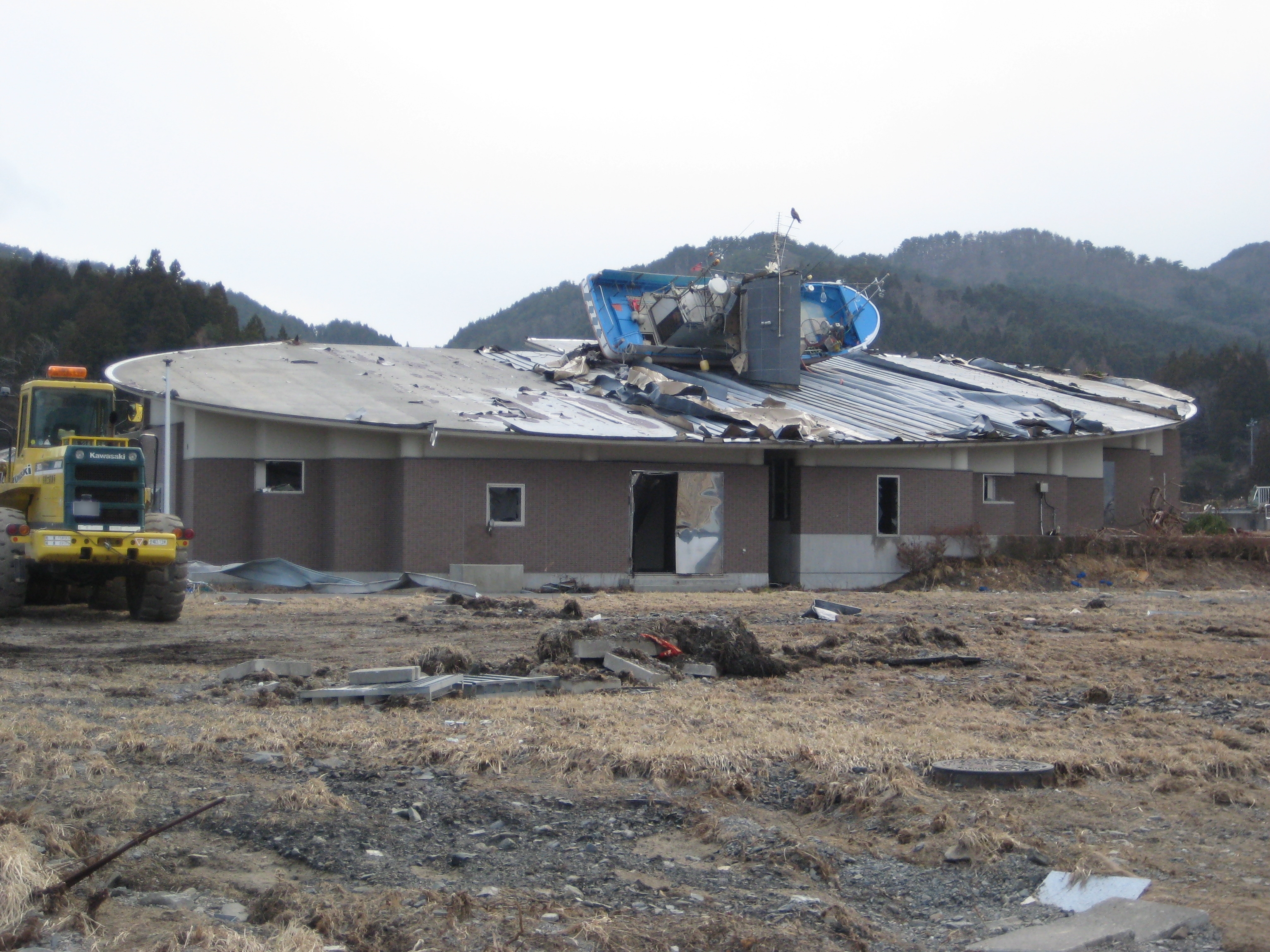 集落排水処理施設の上には津波によって打ち上げられた船が乗っている