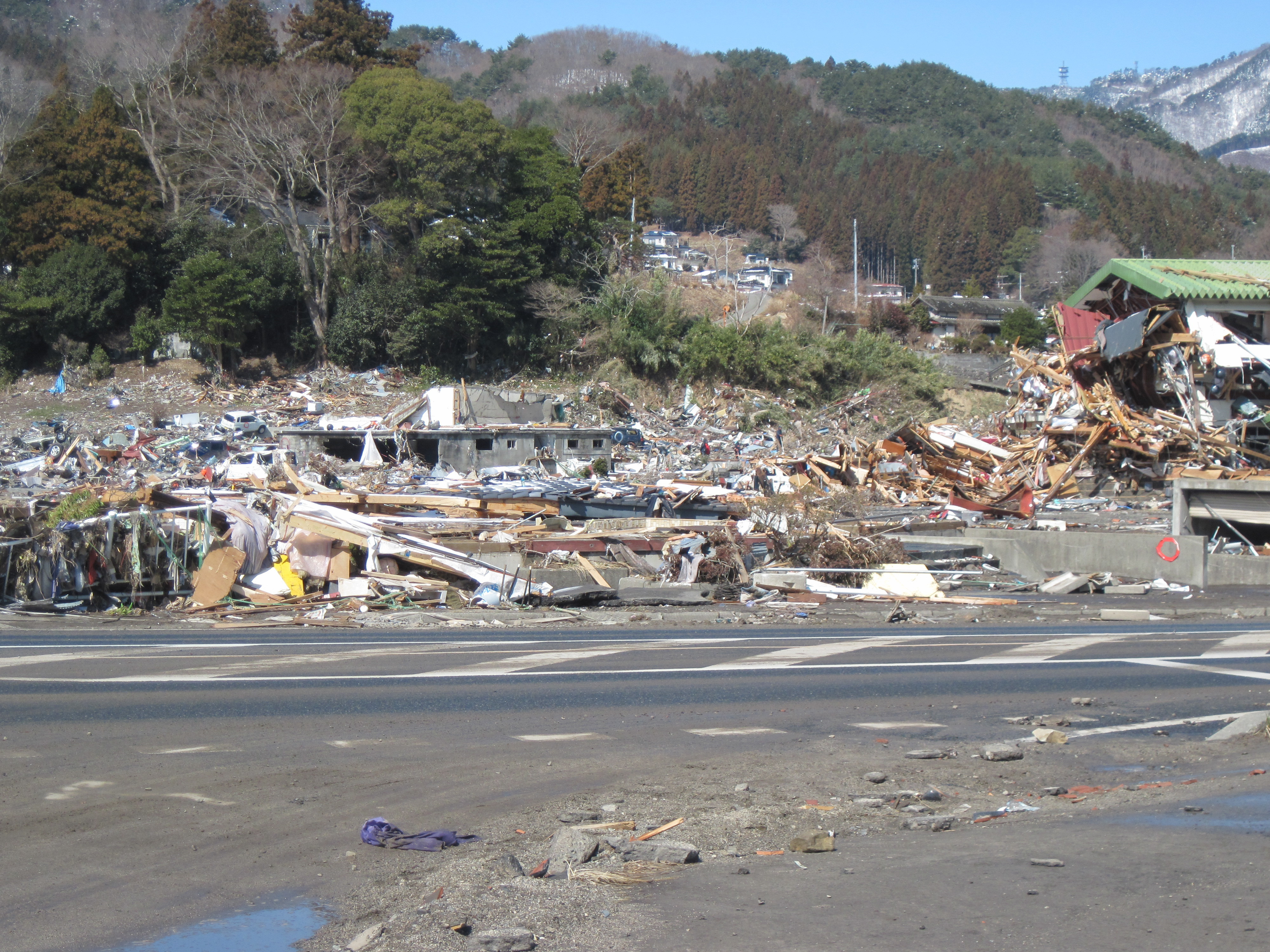 吉里吉里海岸付近の道路側から見た、山側の建物被災状況。