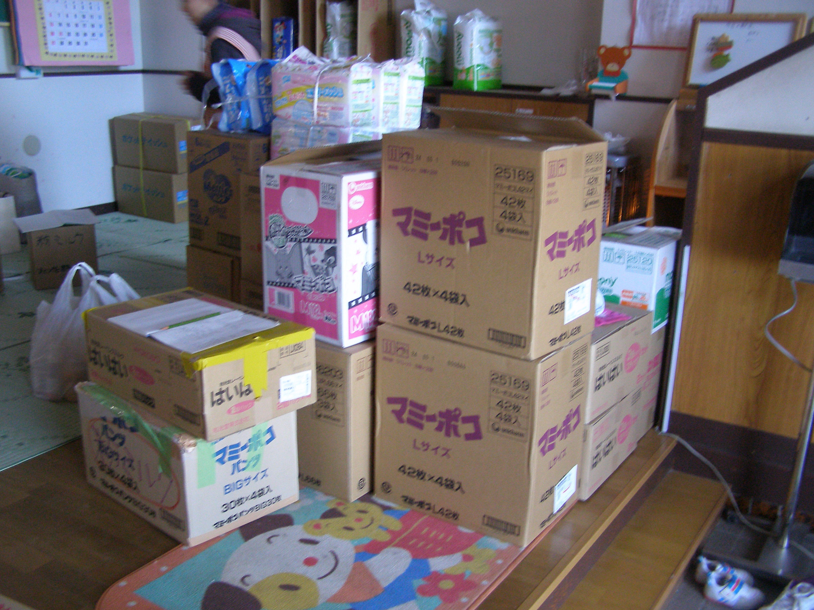 高齢者のいる避難所に大人のおむつ等の介護用救援物資が届いた様子