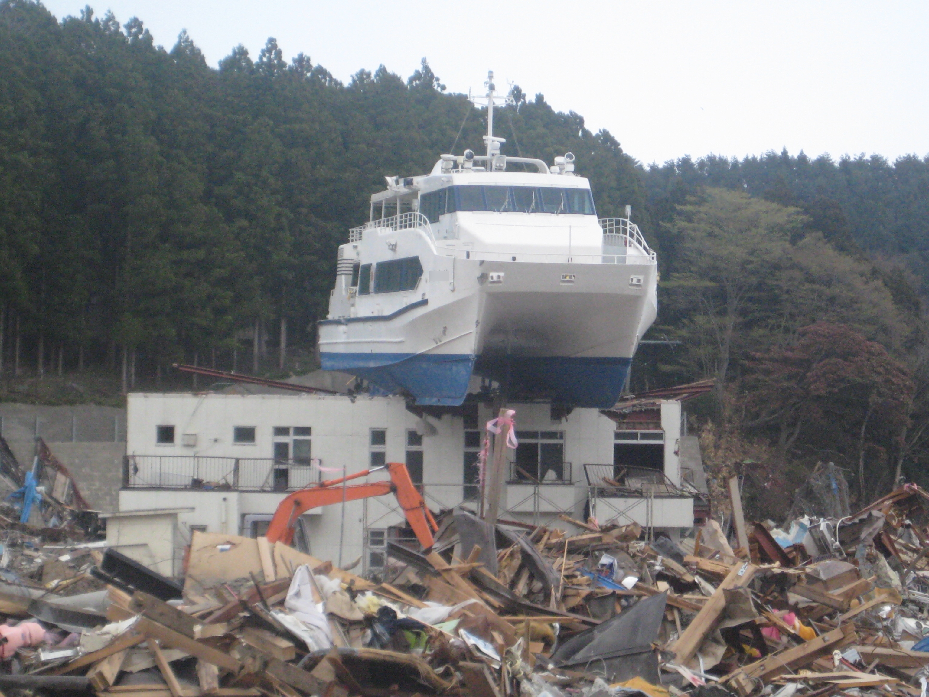 赤浜の、民宿「あかぶ」屋上にのりあげた観光船「はまゆり」