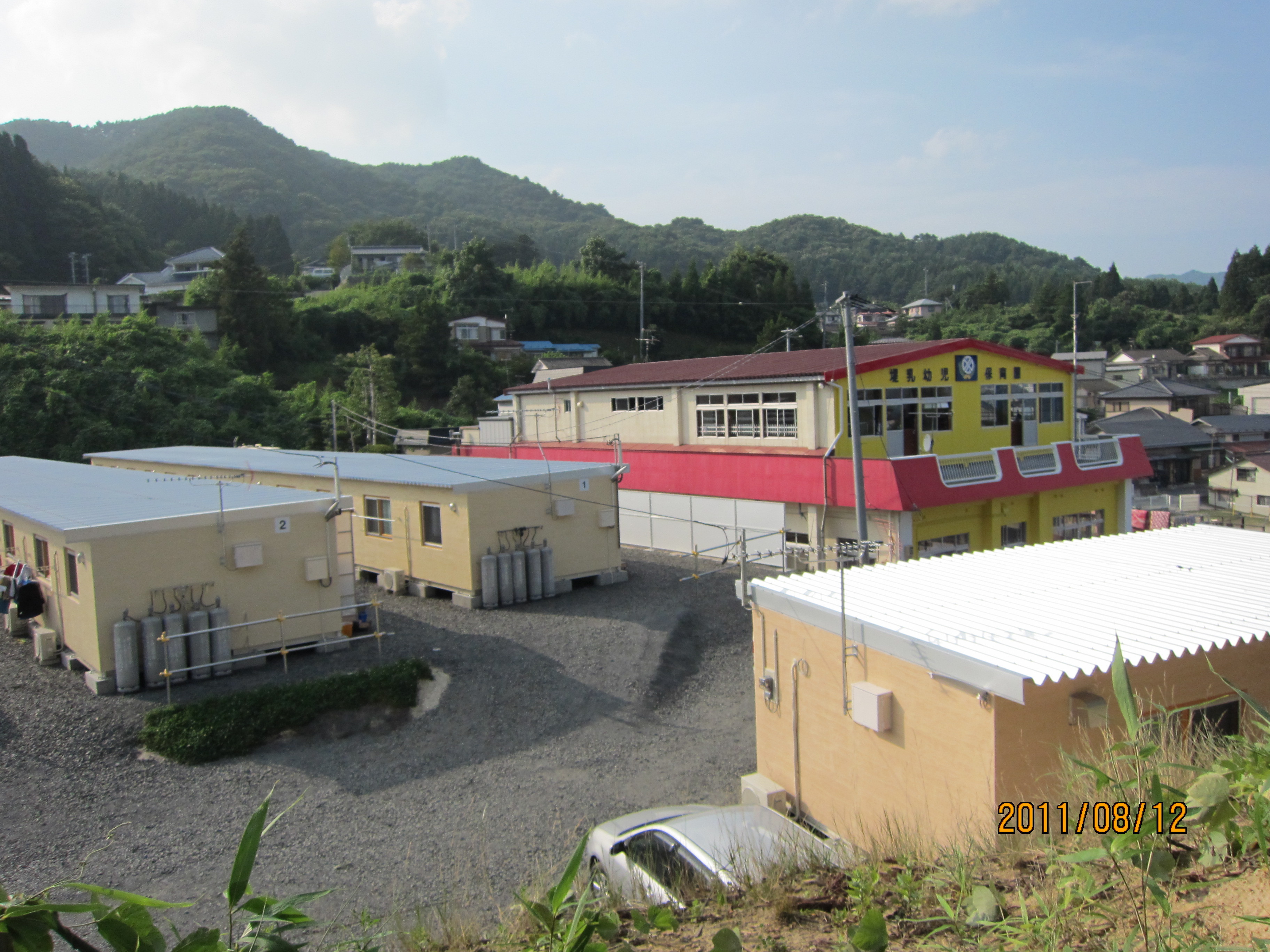 南側方面から撮影した堤乳幼児保育園と仮設住宅。無事に残った住宅地が見える。