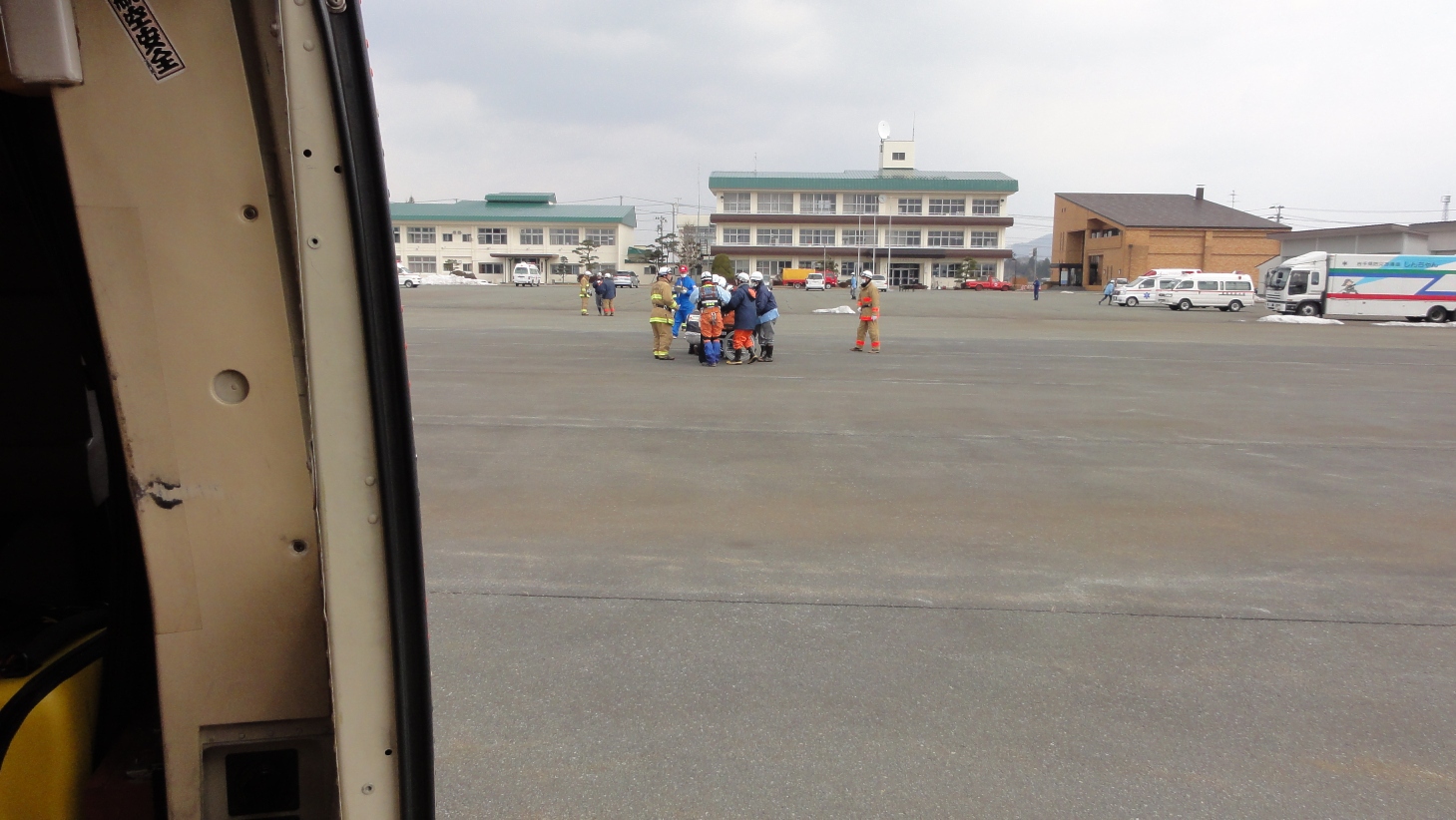 降ろした怪我人を急いで搬送するレスキュー隊員。奥から引き受けに近づいてくる他の隊員と救急車両の姿も見える。