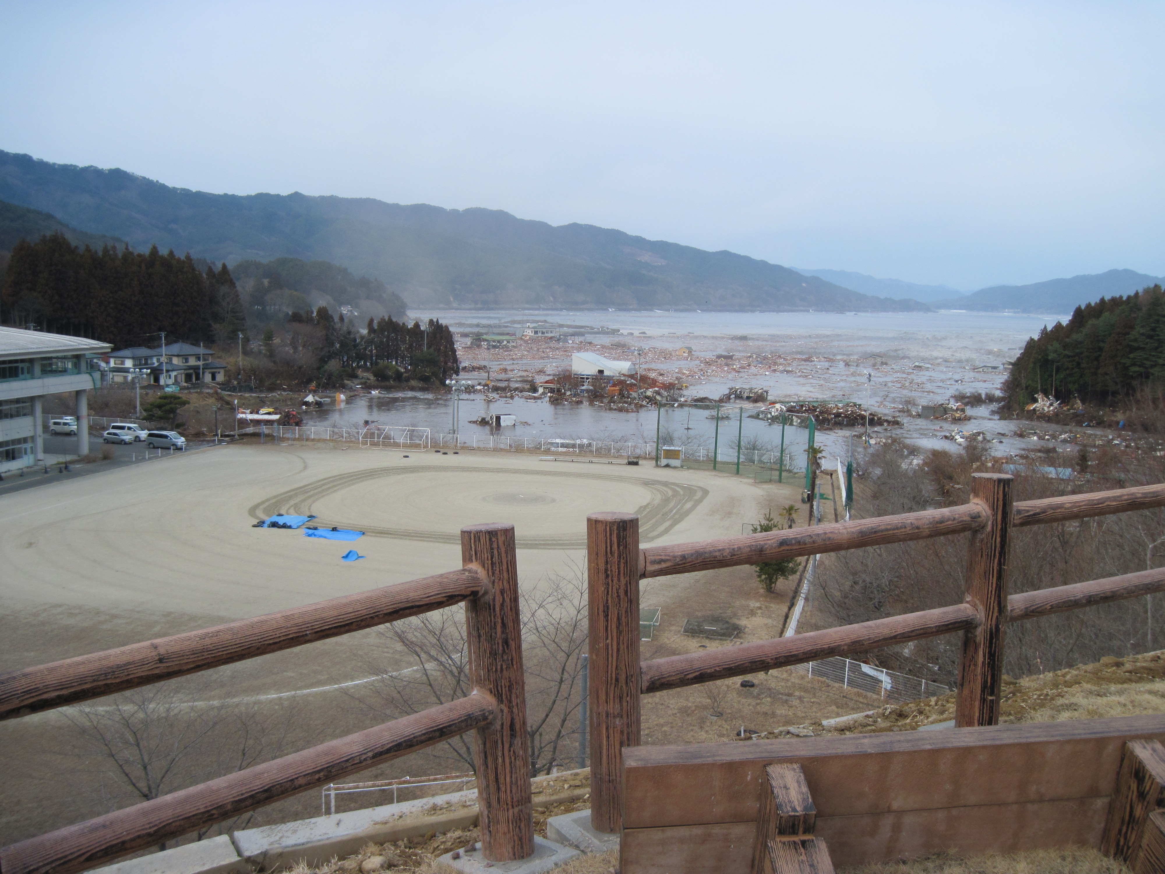 吉里吉里の特養「らふたぁヒルズ」からみた津波。吉里吉里中学校の校庭まで津波が迫っており、町内は津波により水没している。