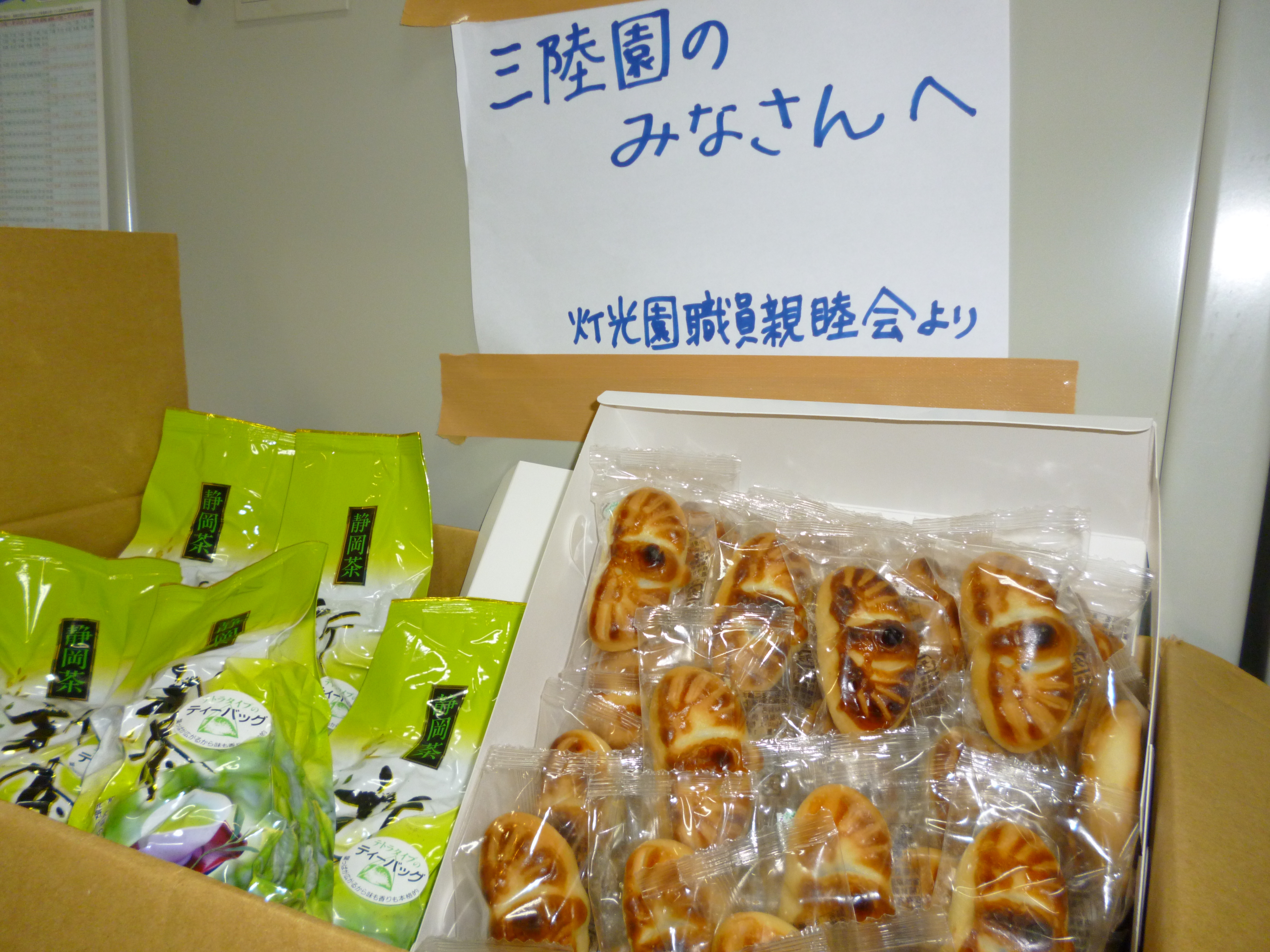 灯光園職員親睦会より三陸園への支援物資。お茶のティーバックとお菓子。