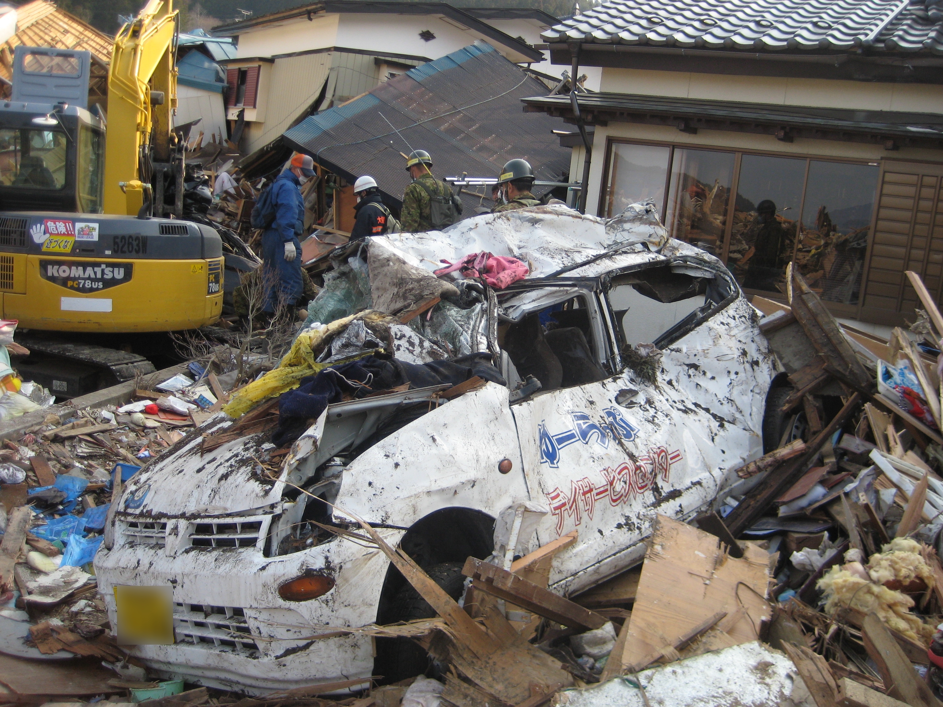 自衛隊と消防署による重機を使用した捜索活動。被災車両の姿も見える。