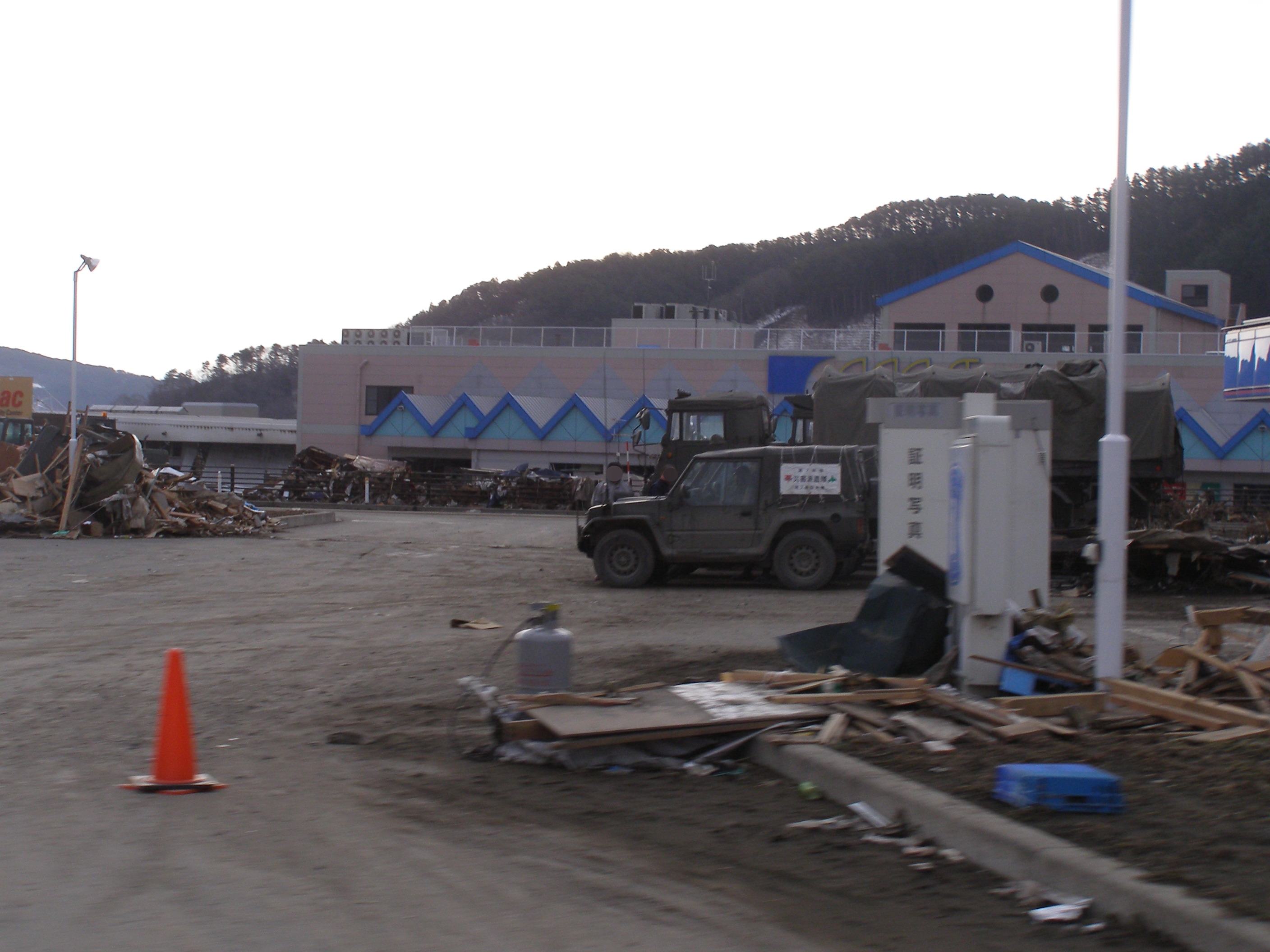 マスト前のローソン跡に停車する自衛隊車両。付近にはガレキが散乱し、奥にはマストも見える。