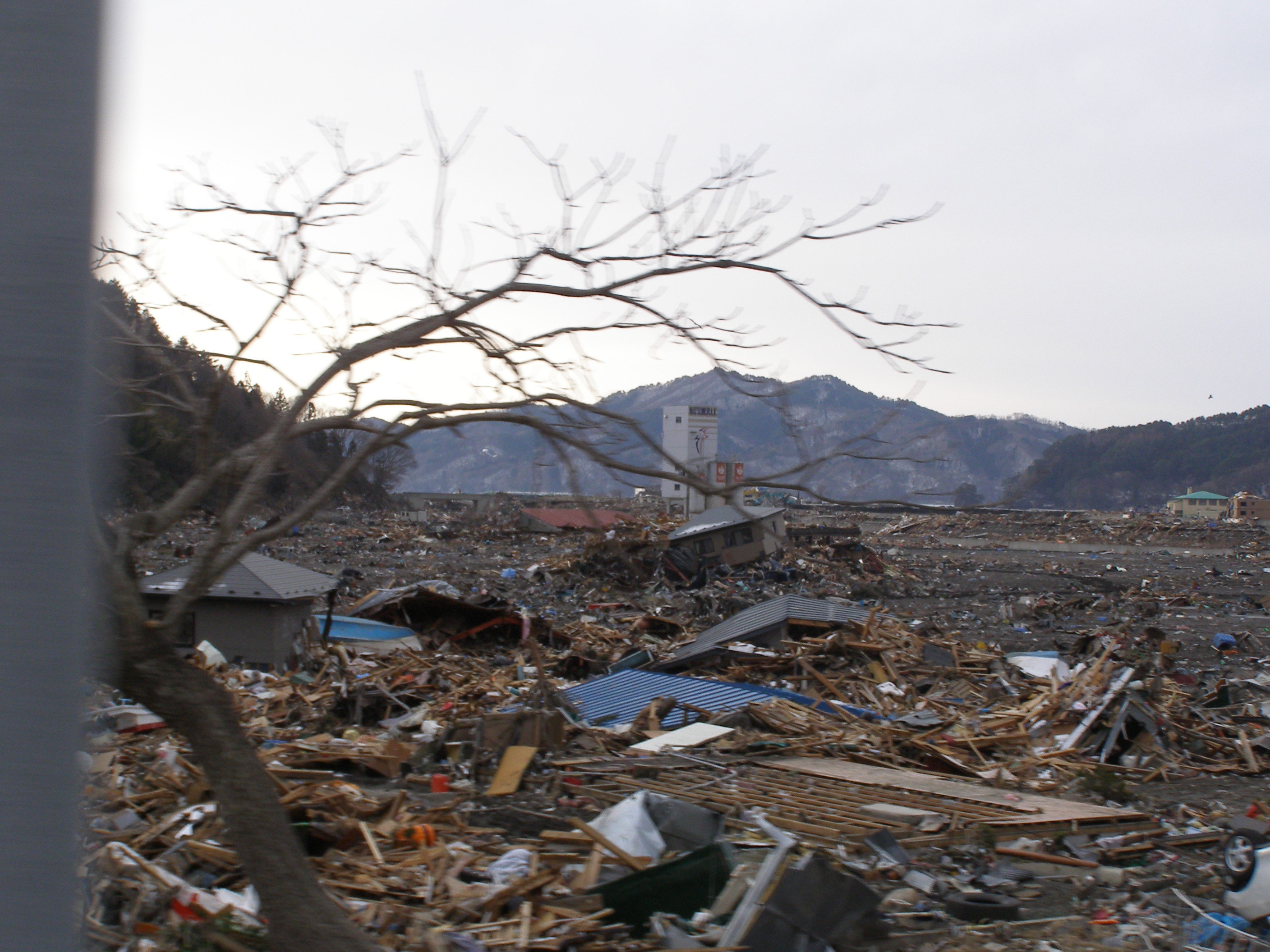 バイパス方面の道路脇から見た大槌町大槌の様子。ガレキが押しよせ辺り一面埋まっている。奥には大きな建物も見える。