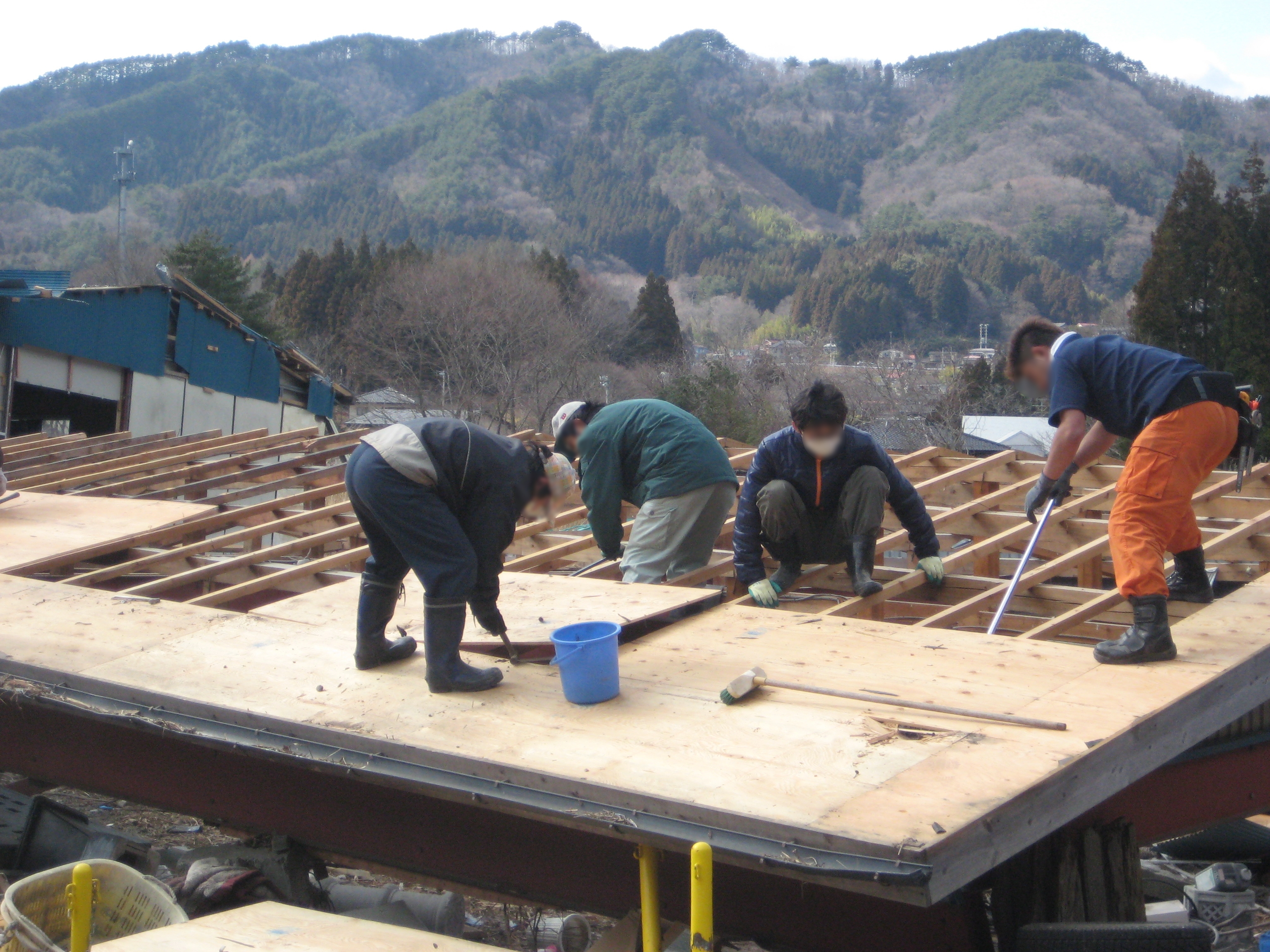 被災した建物を人力で解体作業中の人々。屋根に登ってバールなどの工具を使い作業をしている。