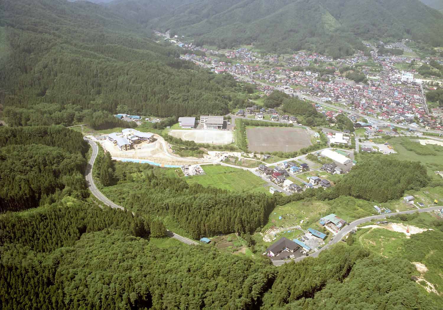 震災の前に上空から撮影された写真。震災前の美しい町並みが見られる風景。中央には吉里吉里中学の校庭とグランド。