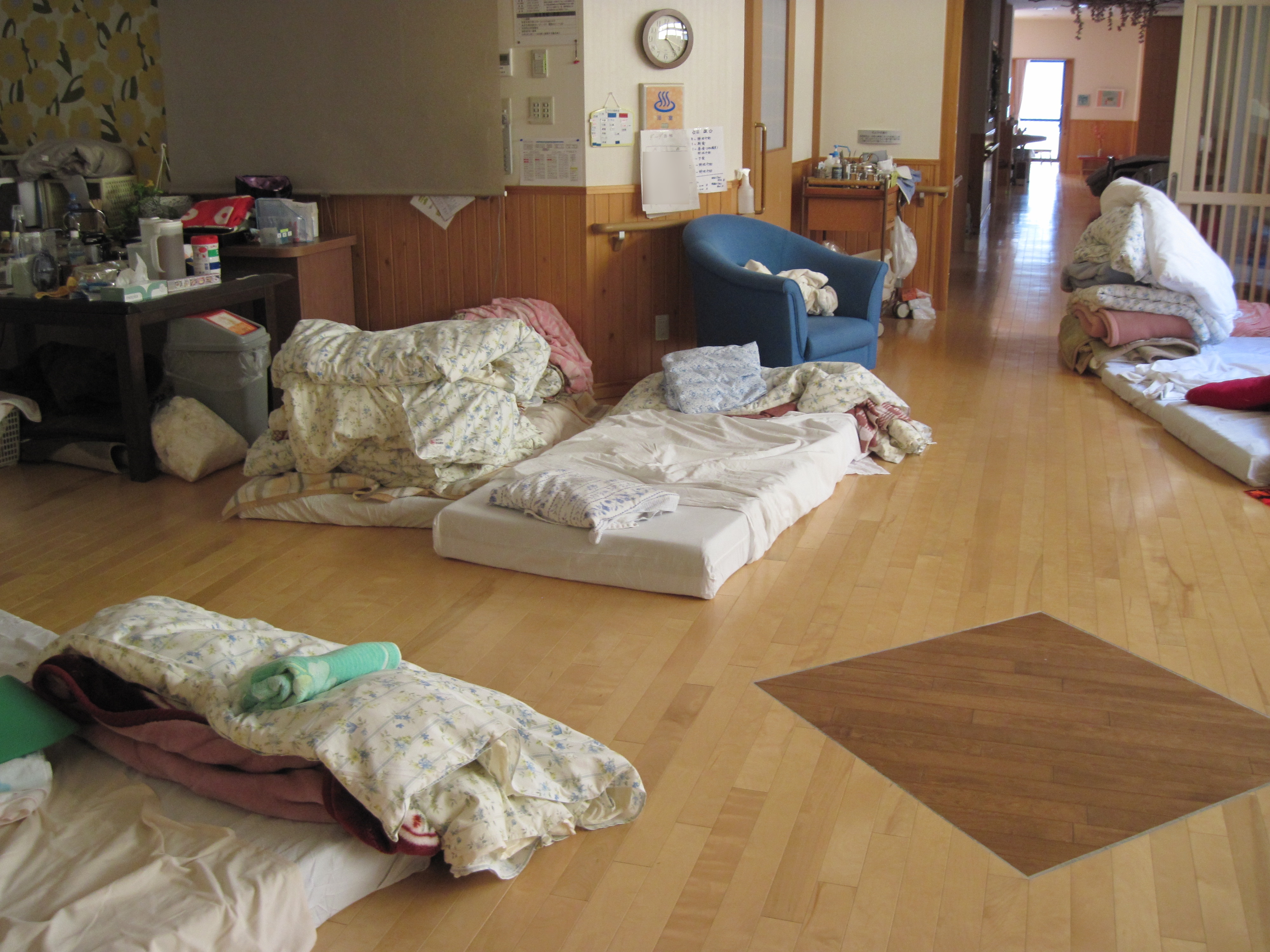 避難所での風景。施設の廊下に布団を敷いてそれぞれの場所を作っているようにも見える