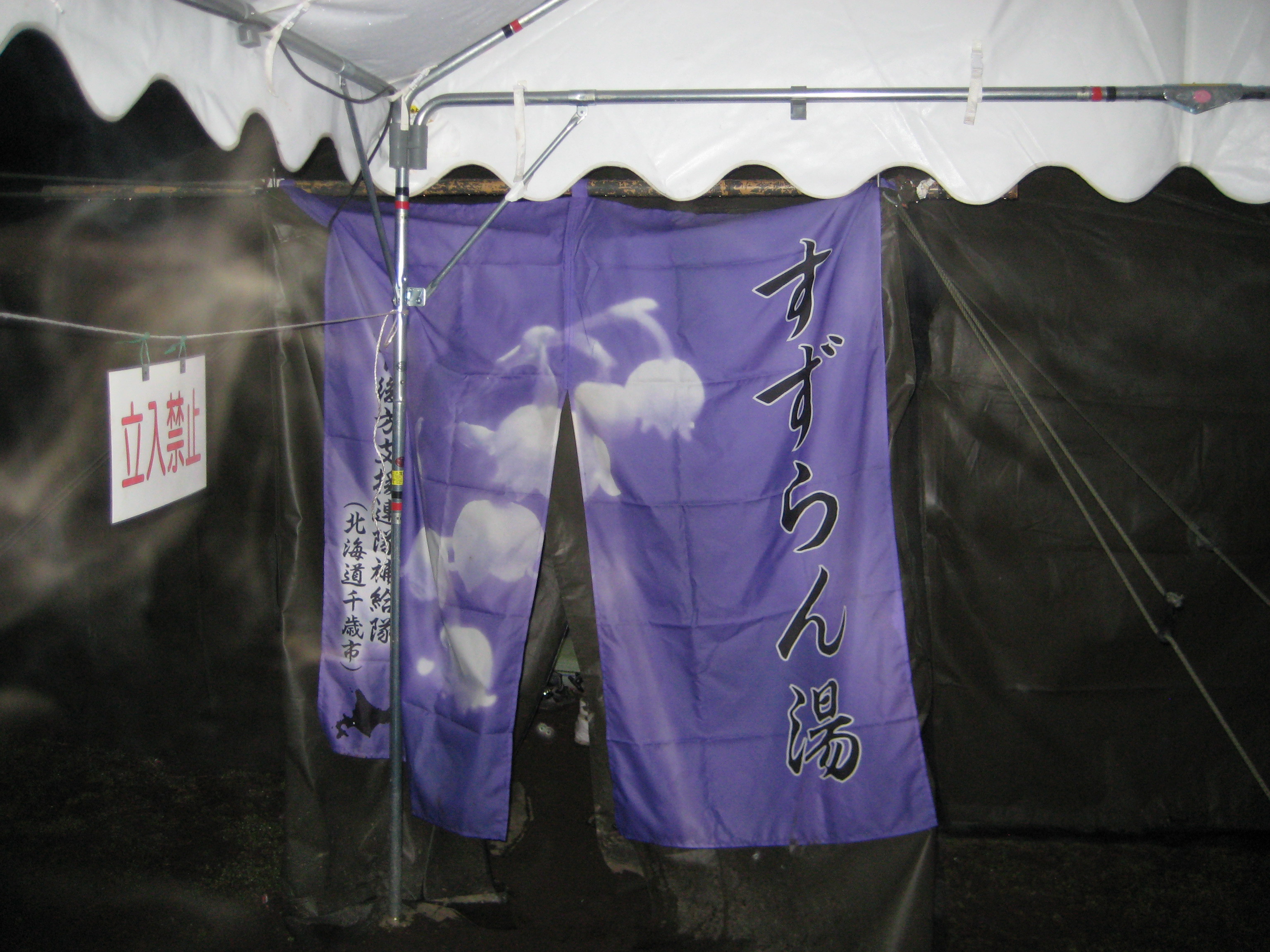 自衛隊が大槌町内に設置した仮設銭湯すずらん湯。北海道千歳市の入った紫の暖簾が目印。