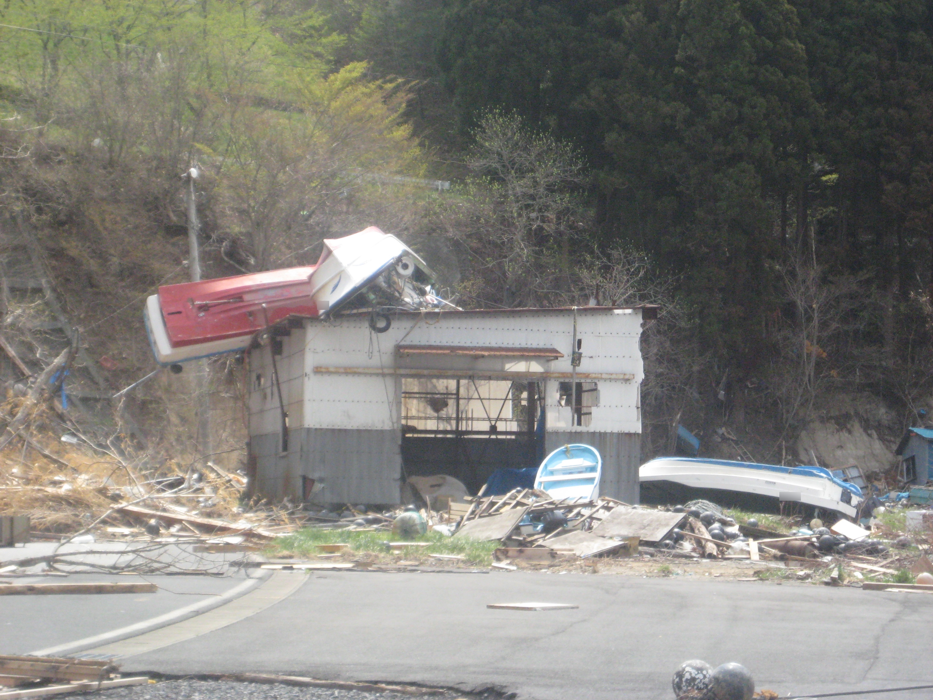 建物に打ちあげられた漁船