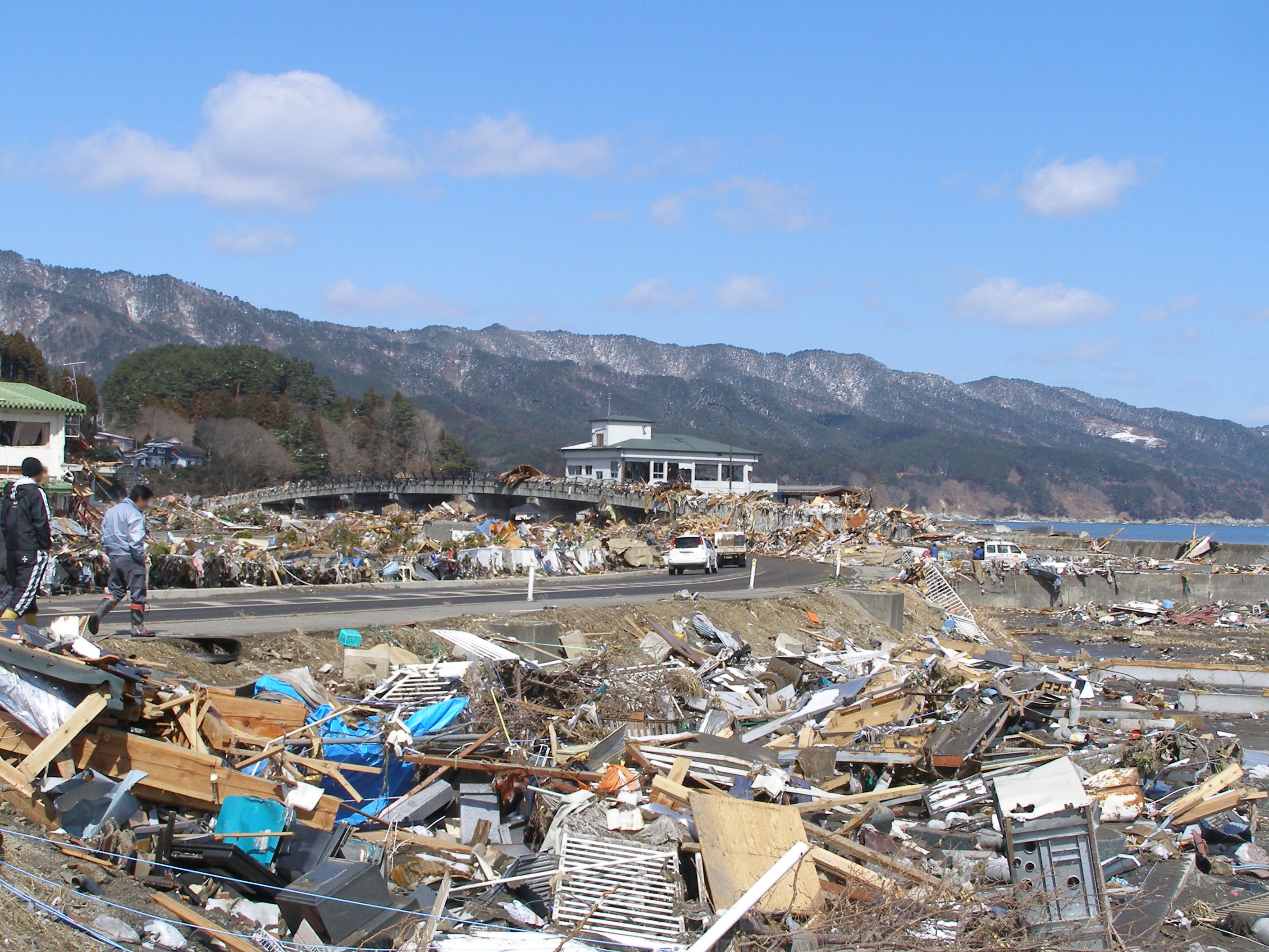 吉里吉里駐在所前の国道45線道路から見た付近の被災状況。手前のレストランは全壊し奥の環境改善総合センターは建物の外観をかろうじて残している。橋の上道路脇にはまだガレキが散乱している。