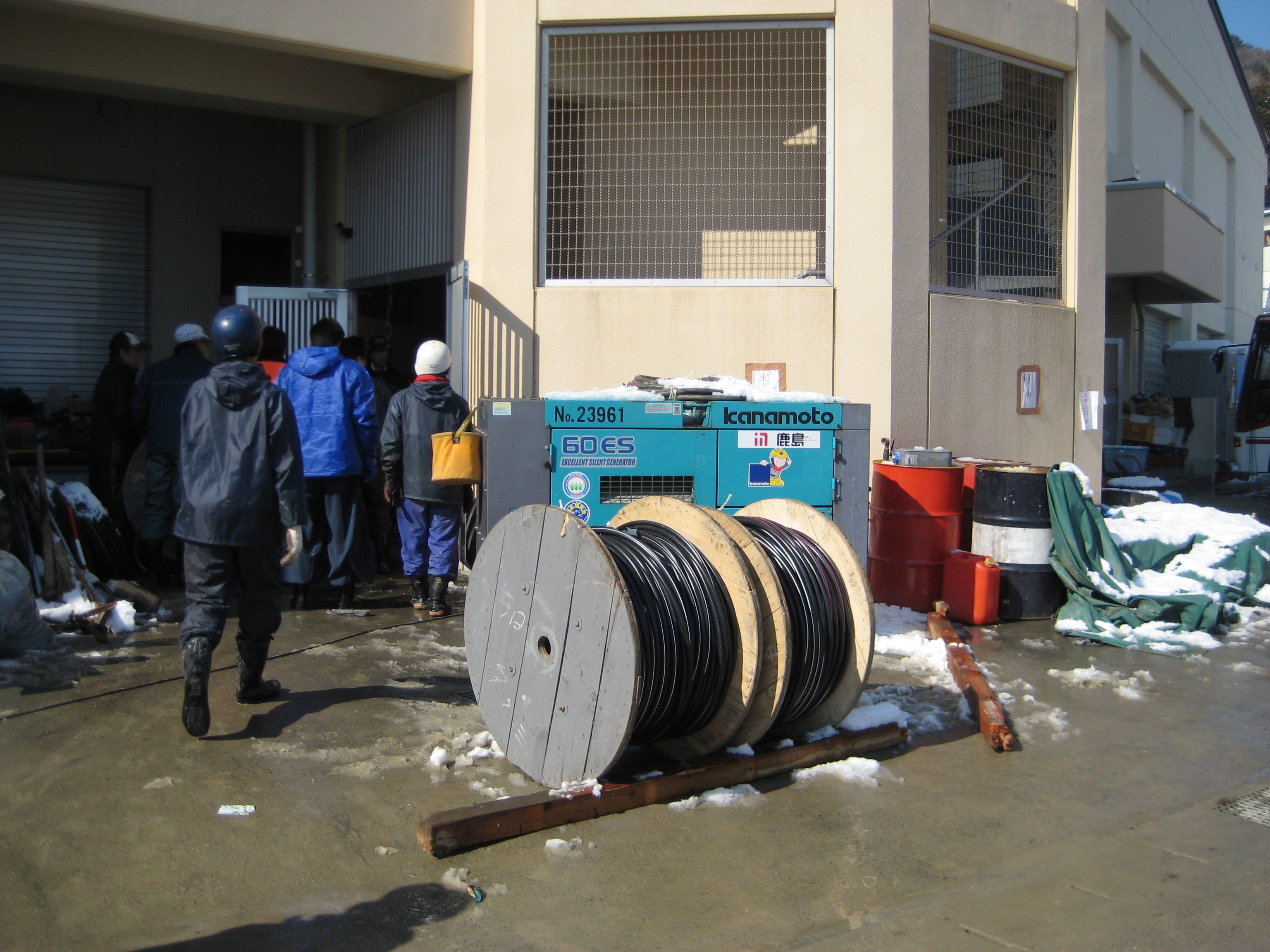 吉里吉里小学校で復興に向けて作業する人々。ケーブルや発電機に囲まれ懸命に作業している様子。